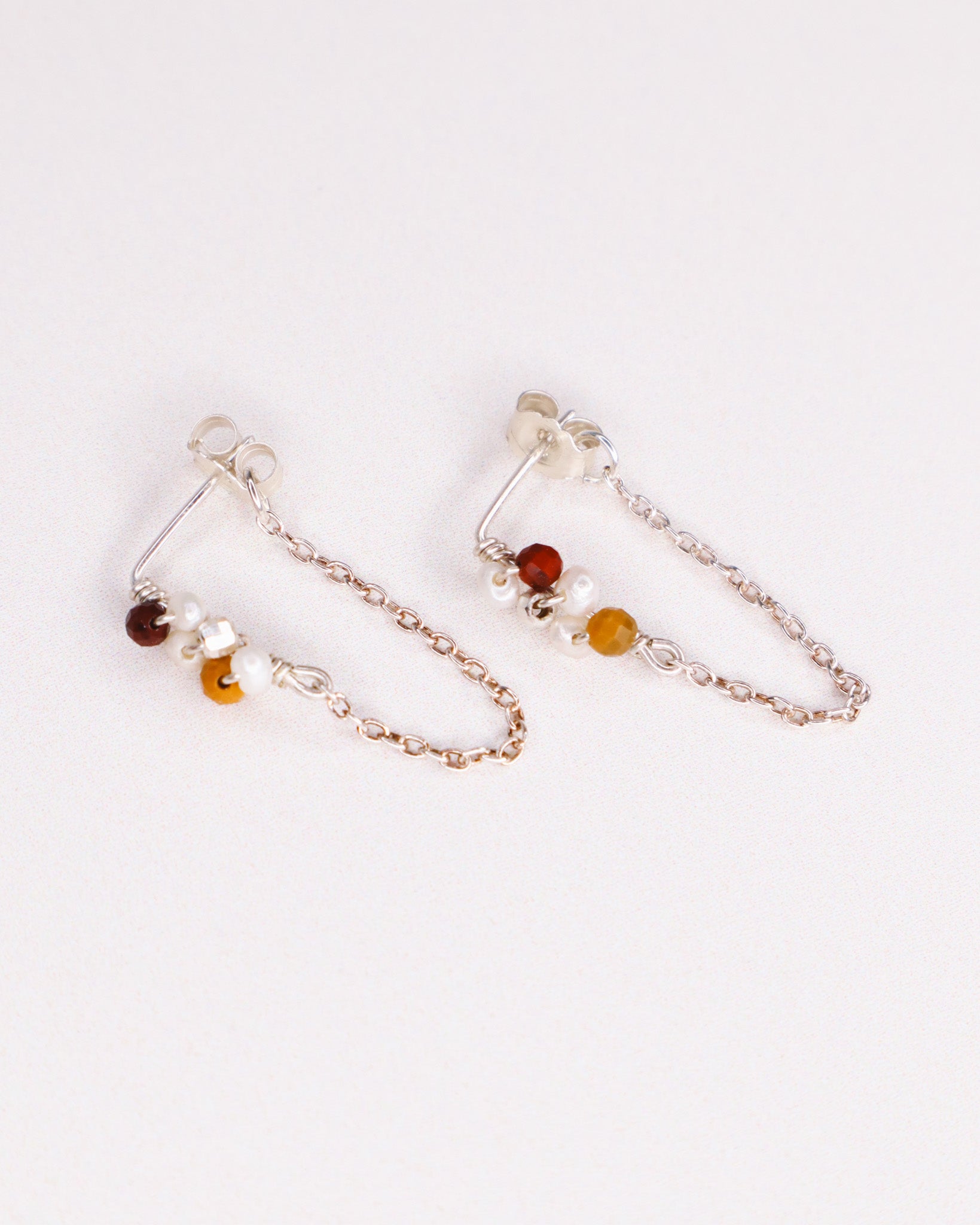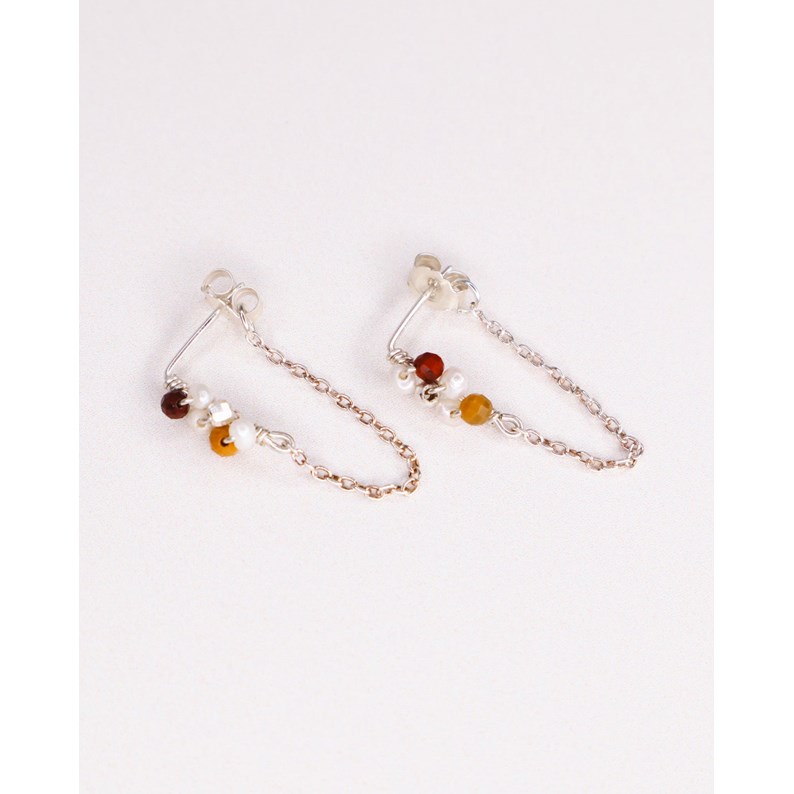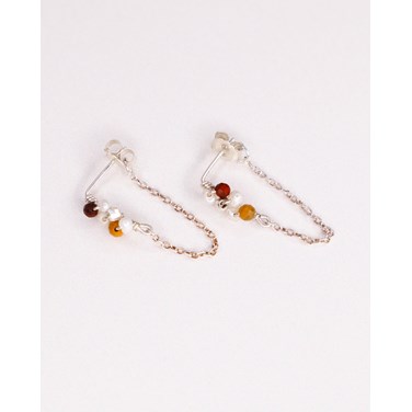 Ornées de perles de culture blanches et de pierres naturelles de jaspe mokaïte marron, rouge et jaune. Les boucles font 1,5cm de longueur, et la chaine passe derrière le lobe.