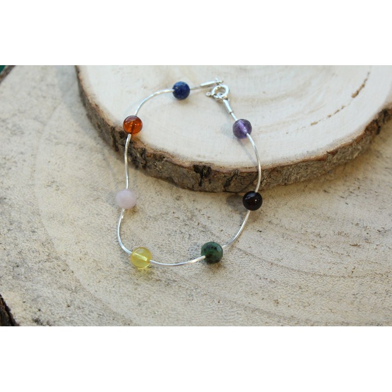 Ce joli bracelet est fabriqué en argent, avec ses différentes pierres naturelles. Chaque pierre correspond à un Chakra : violet pour le chakra Félicité, rouge pour l'Energie, vert pour la Tendresse, bleu pour l'Expression, jaune pour le Soleil orange pour la méditation et rose pour l'Intuition.