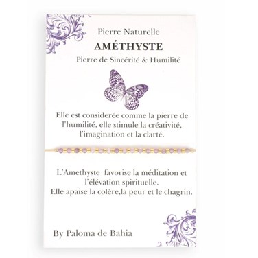 Bracelet fin ajustable avec cordon, pierres naturelles Améthyste et perles en acier inoxydable doré. L’Améthyste est considérée comme la Pierre de l’humilité et la pierre de la sagesse. Elle stimule la créativité, l’imagination et la clarté. Cette Pierre joue un grand rôle et favorise non seulement la méditation, la concentration, mais aussi l’élévation spirituelle. Elle se charge aussi d’apaiser la colère, la peur, les inquiétudes, les angoisses, la tristesse et le chagrin. Chaque bracelet est fait à la main donc différents les uns des autres, la couleur des pierres peut varier ainsi que l’ordre des billes en acier inoxydable, chaque bracelet est unique ! Noeud coulissant allant de 2 cm à 8cm donc ajustable à adultes et enfants.