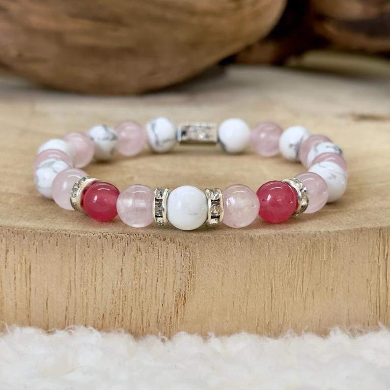 Ce bracelet est fabriqué à partir de quartz rose et d'howlite.