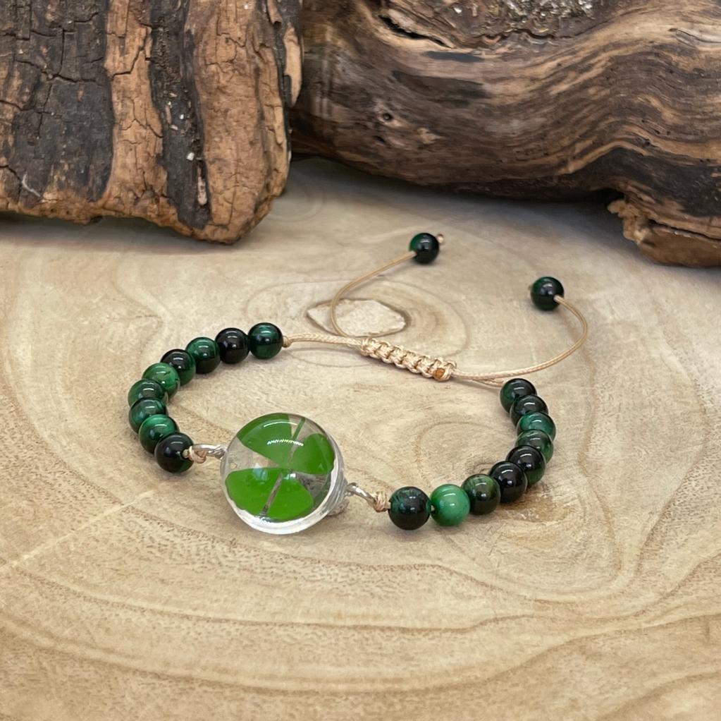 Ce bracelet contient un véritable trèfle à 4 feuilles dans une poche de verre.