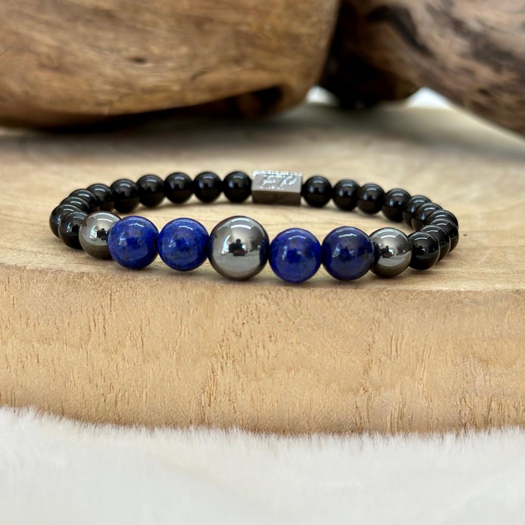Le lapis-lazuli est composé de lazurite qui constitue le composant essentiel de ce minéral à la couleur bleue profonde mais également de pyrite, un minéral de couleur jaune qui donne au lapis-lazuli des reflets dorés.