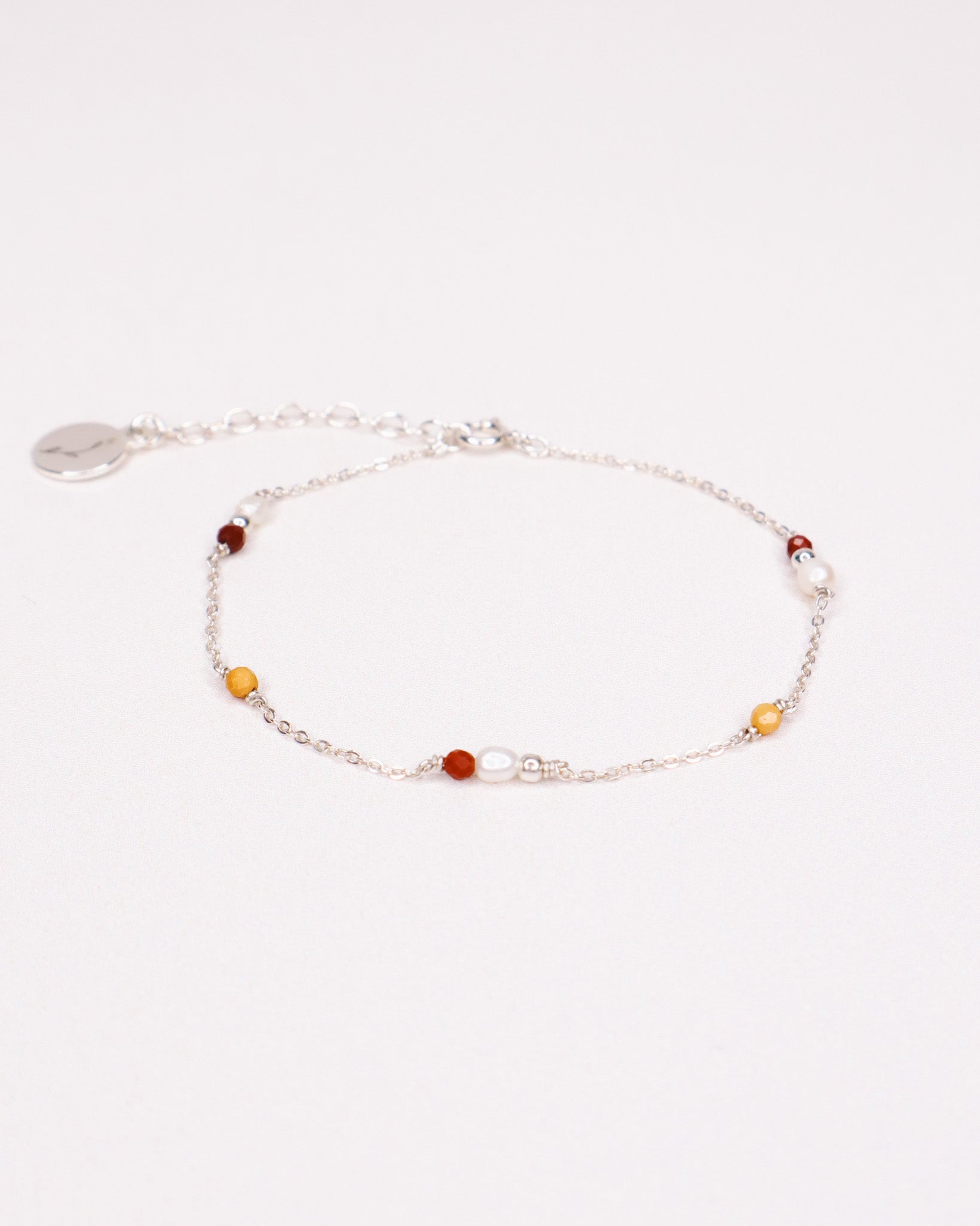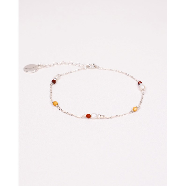 Incrusté de perles de culture blanches et de pierres de jaspe mokaïte marron, rouge et jaune. Le bracelet fait 14,5cm de longueur avec une chaine d'extension de 3cm.