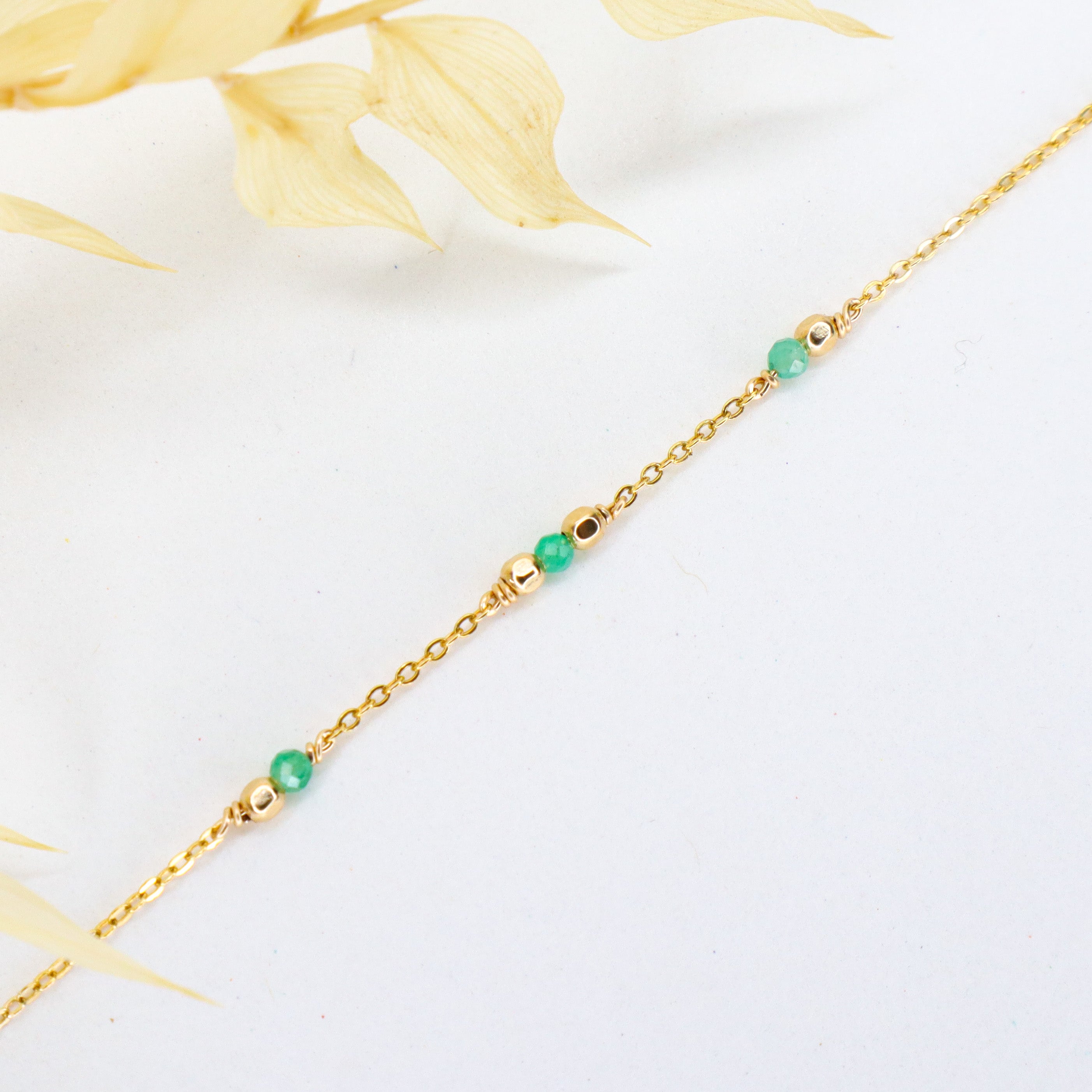Ce bracelet en pierre de naissance est en goldfilled (alliage de laiton et d'or 14ct), ornée des pierres précieuses d'émeraude.