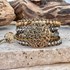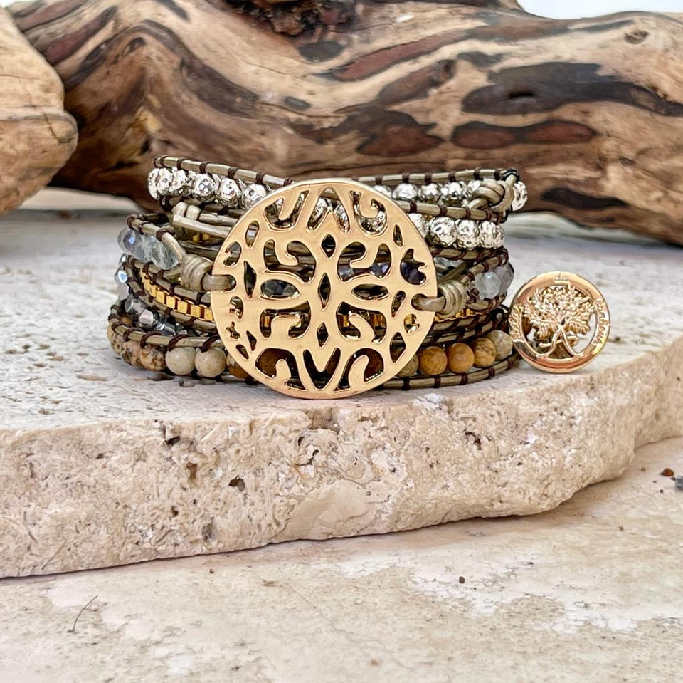 Ce bracelet est composé de pierres naturelles telle que la labradorite, le jaspe paysage, mais aussi des matériaux nobles tel qu'un médaillon central en plaqué or et des lanière de cuir véritable. Il est réalisé à la main avec un soin particulier et conçu pour être ajustable afin de convenir à la plupart des poignets.
