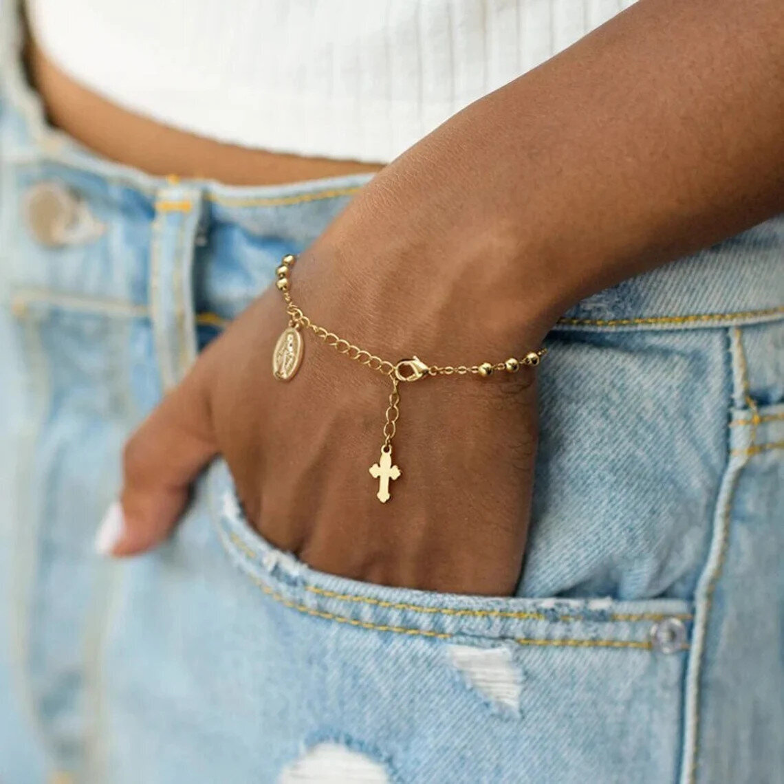 Montrez votre côté spirituel avec ce délicat bracelet en chaîne orné d’une médaille de la Vierge Marie et d’une breloque en forme de croix qui pend de la chaîne. Avec chaîne satellite et prolongateur. La longueur réglable rend le bracelet de la Vierge Marie adapté aux petites et grandes tailles de poignet.