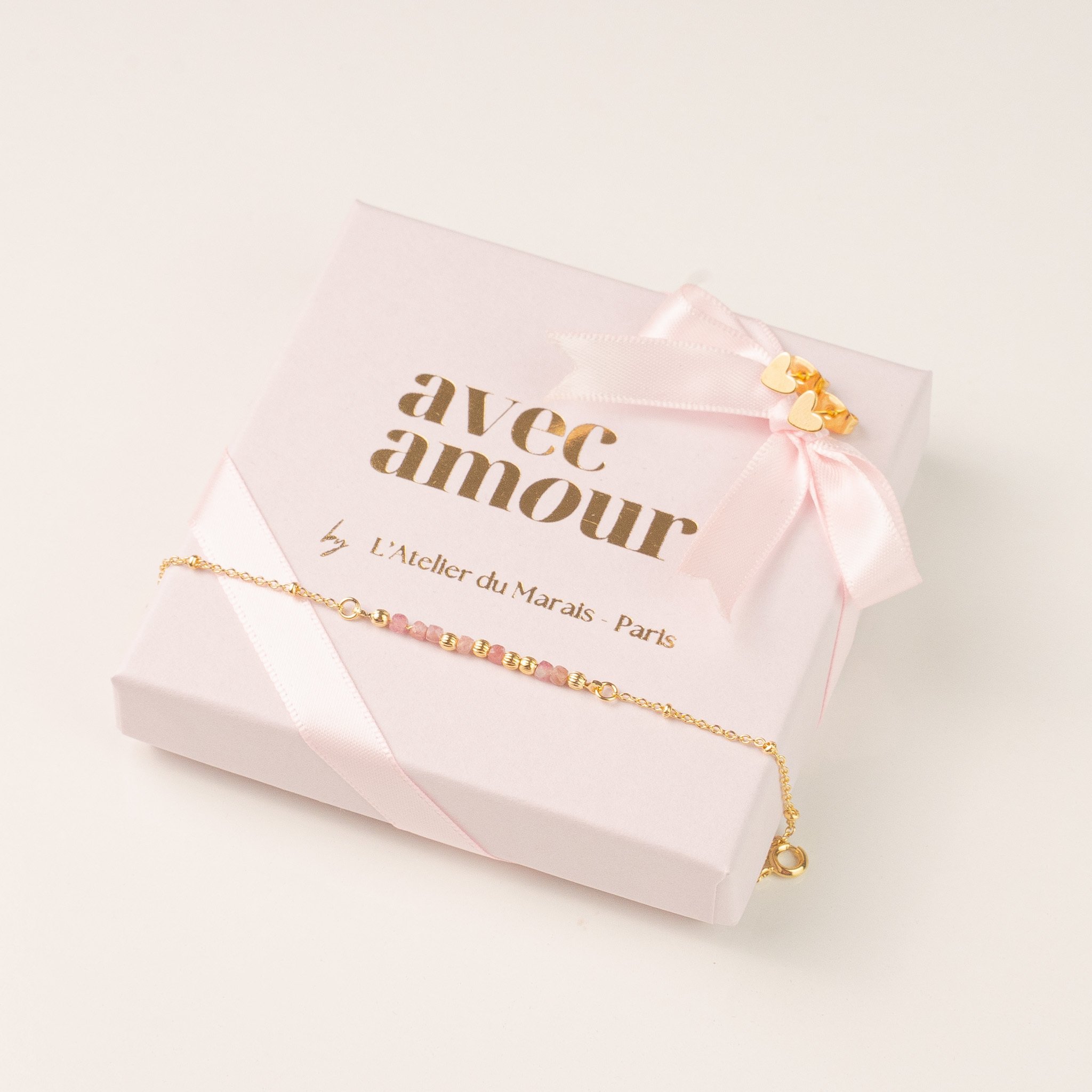 L’intérieur de la boite révèle le message secret contenu dans le bracelet ainsi que les vertus réconfortantes de la tourmaline rose, ajoutant ainsi une signification toute particulière à ce cadeau.