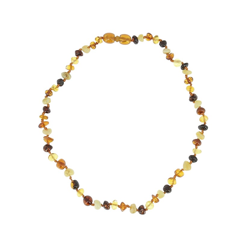 Ce bijou, réalisé à la main, est en Ambre véritable de la Baltique de plus de 40 millions d'années. Chaque perle y est séparée de sa voisine par un nœud de sûreté. Fermoir clipsé.