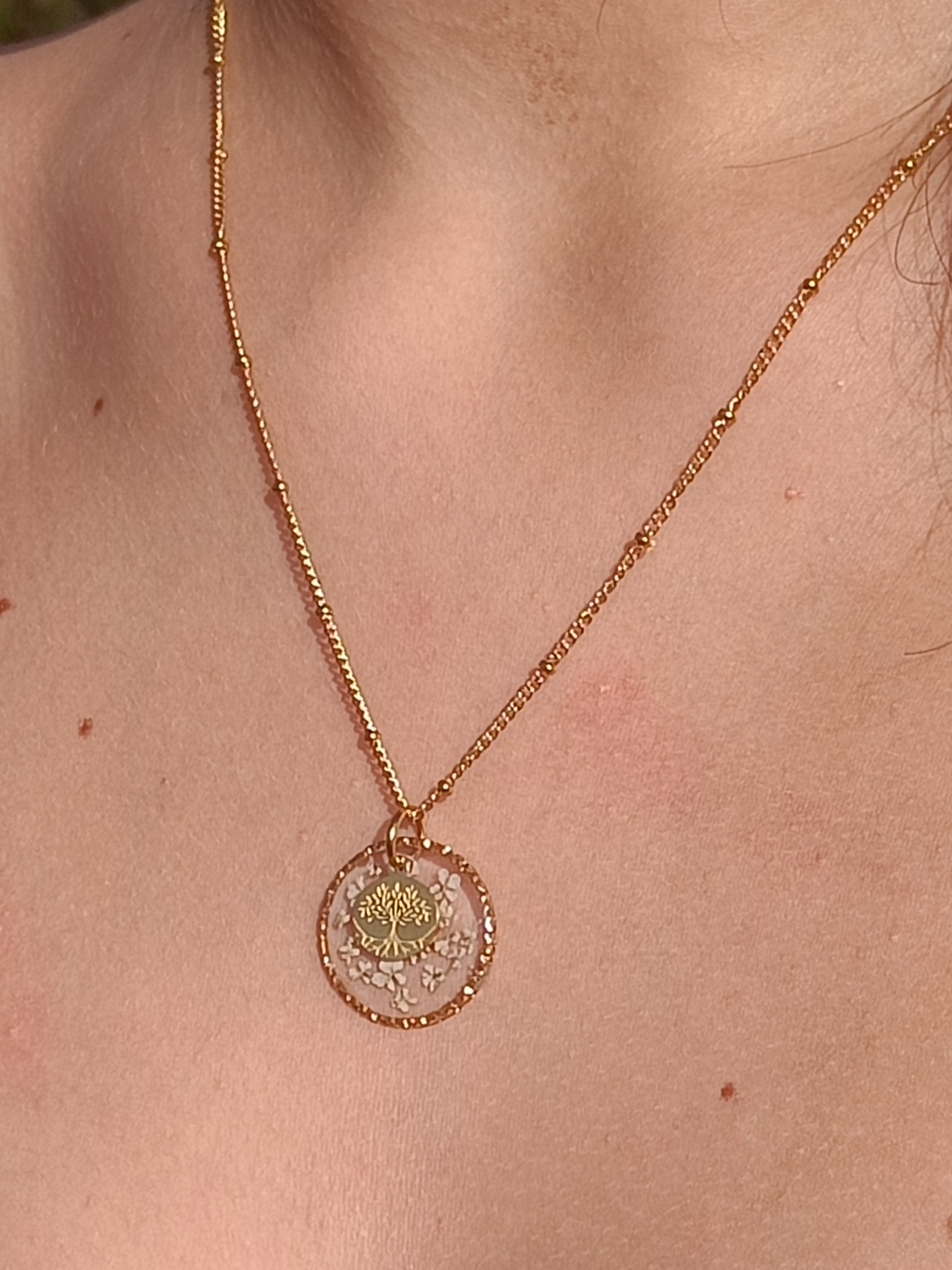 Collier artisanal en acier inoxydable fleurs séchées arbre de vie
