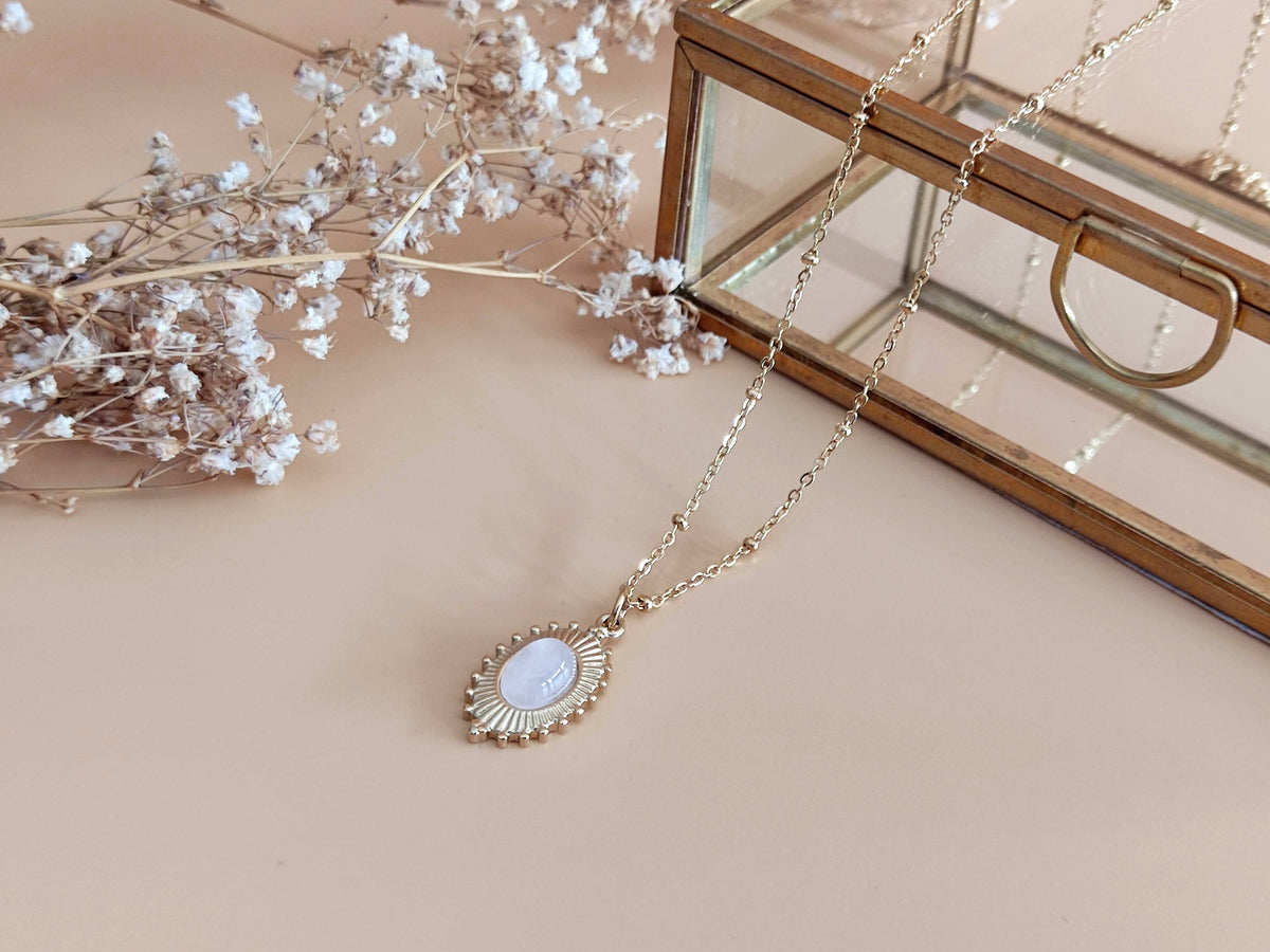Laissez-vous charmer par la douceur et l'éclat de ce bijou. Ce collier pendentif ovale est orné d'une pierre de quartz rose, symbole d'amour et de confiance, idéal pour exprimer vos émotions les plus sincères.