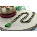 Mala en pierre naturelle. Pompon vert clair en nylon et mélange de coton. Fil vert clair en coton. Longueur du mala : 104 cm. Longueur du pompon : 6 cm. Diamètre de la perle : 0,8 cm.