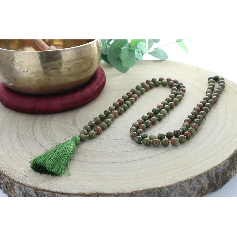 DescriptionA porter comme bijou ou à utiliser pour réciter les mantras lors des séances de méditation, ce mala saura trouver sa place dans le quotidien de chacun. Il est confectionné dans le plus grand respect de la tradition tibétaine. Les 108 perles en pierres naturelles et le pompon qui le composent sont soigneusement montés et noués à la main. L'unakite aide à équilibrer des émotions. Sélectionnée pour ses vertus apaisantes, elle atténue les doutes et favorise la persévérance pour surmonter les obstacles.