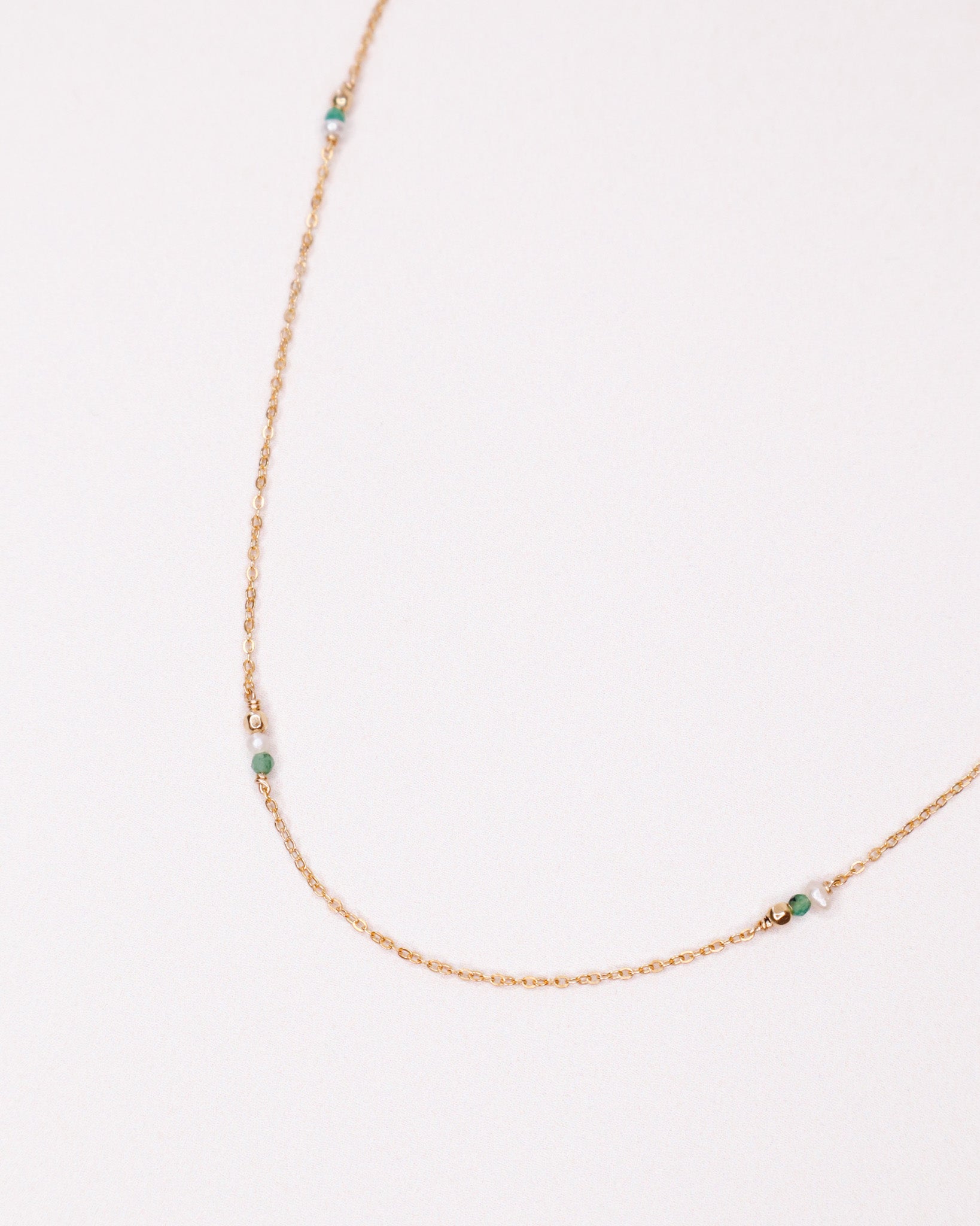 Orné de pierres précieuse : perles de cultures blanches et émeraudes vertes.