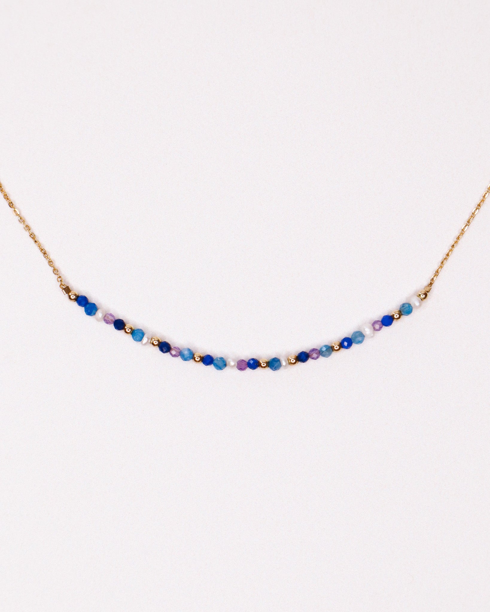 Orné de pierres naturelles de lapis lazuli bleu foncé, de cyanite bleu, d'améthyste violette et de perle de culture. Le collier fait 37cm de longueur avec une chaine de réglage de 4,5cm.