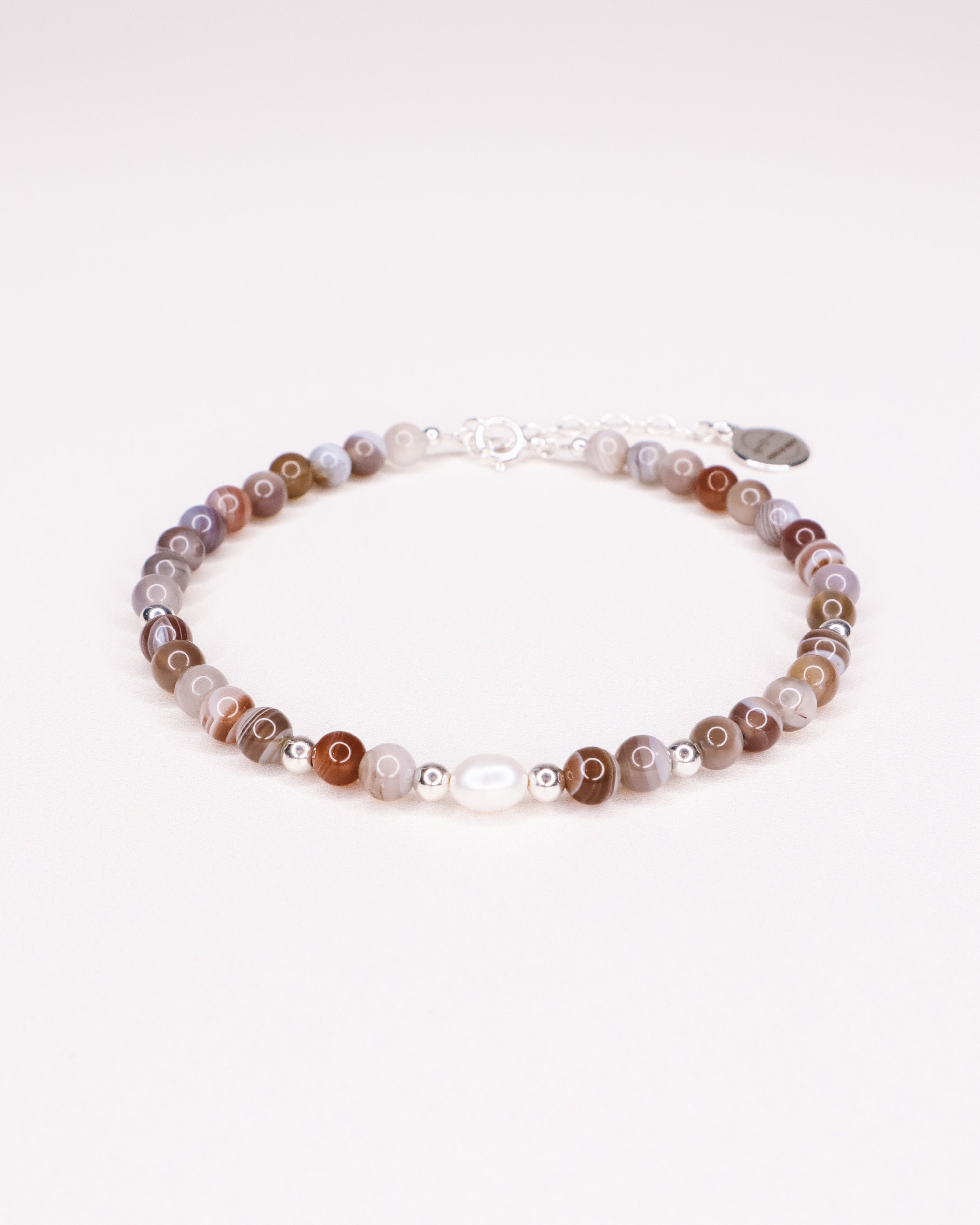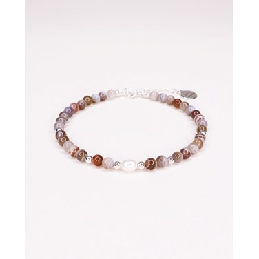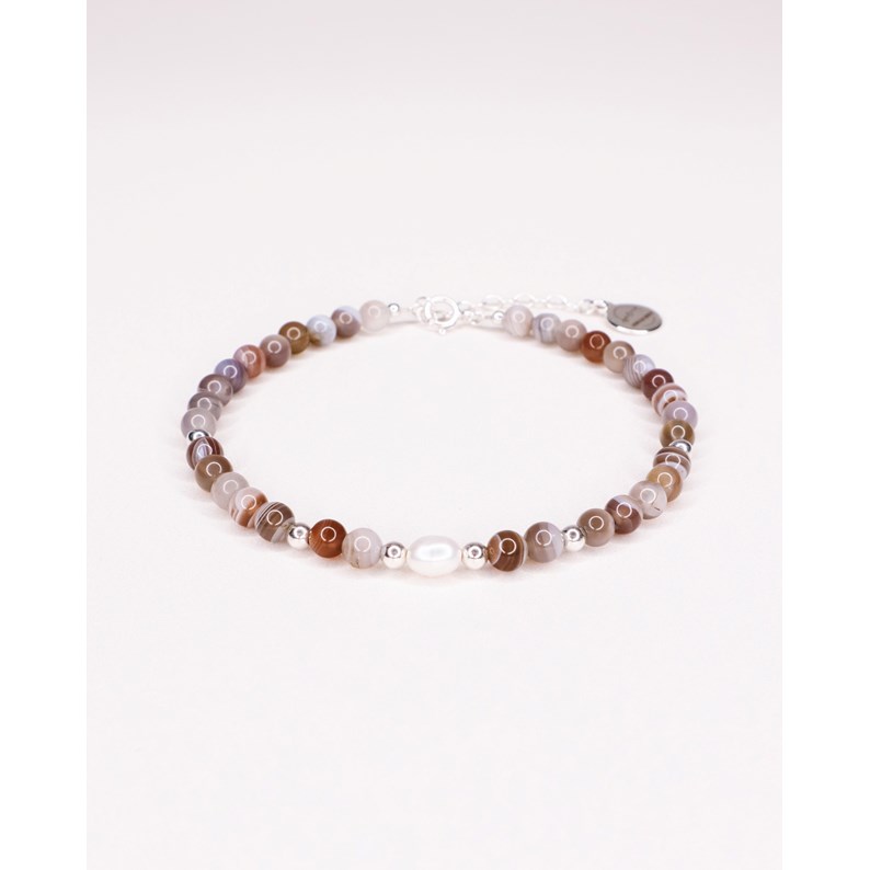 Enfilage tout en perles de culture blanches et de pierres d'agate du botswana. Le bracelet fait 16,5cm de longueur avec une chaine d'extension de 3cm.