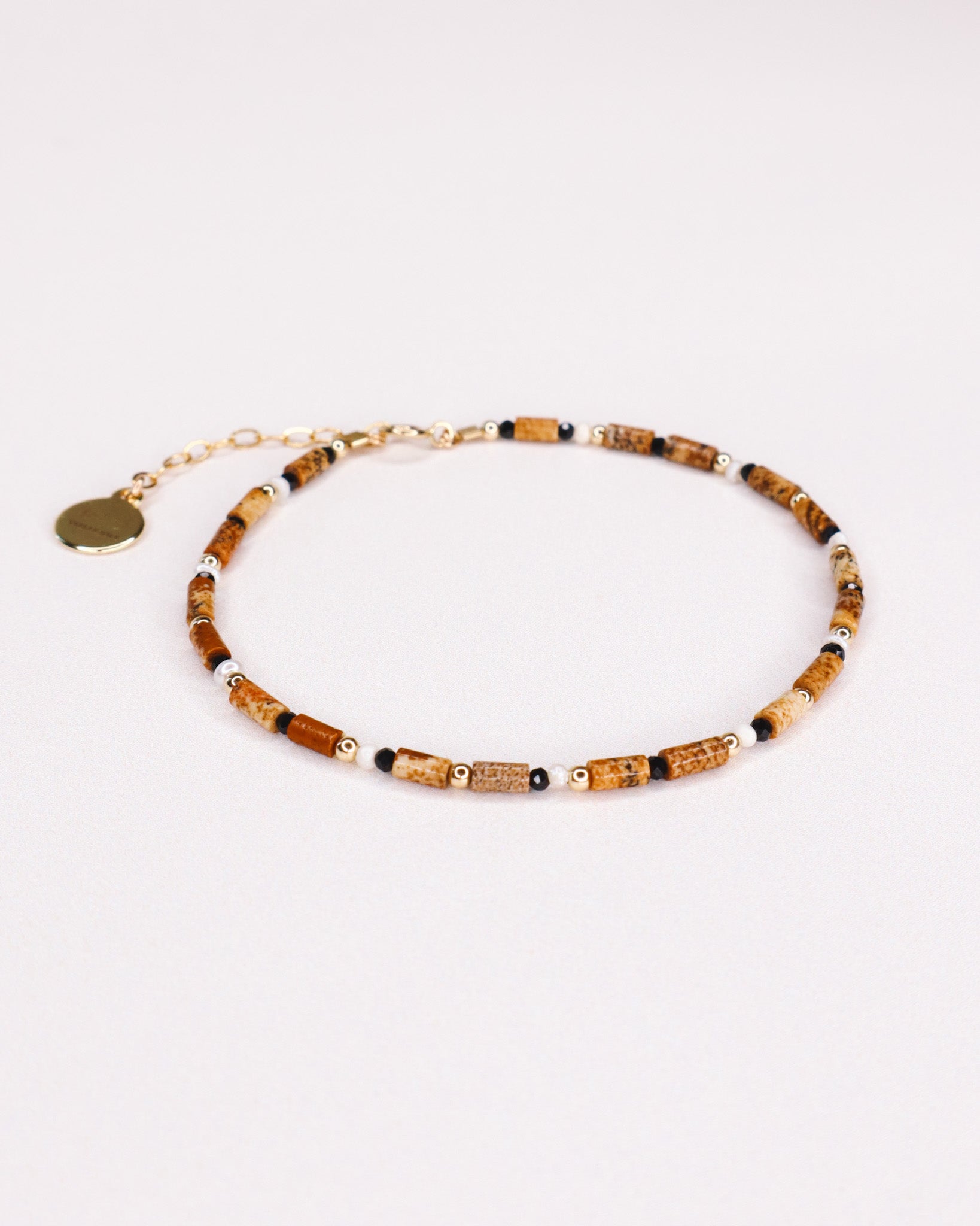 Enfilage de pierres de jaspe paysage marron, de perles de culture et de spinelles noires.