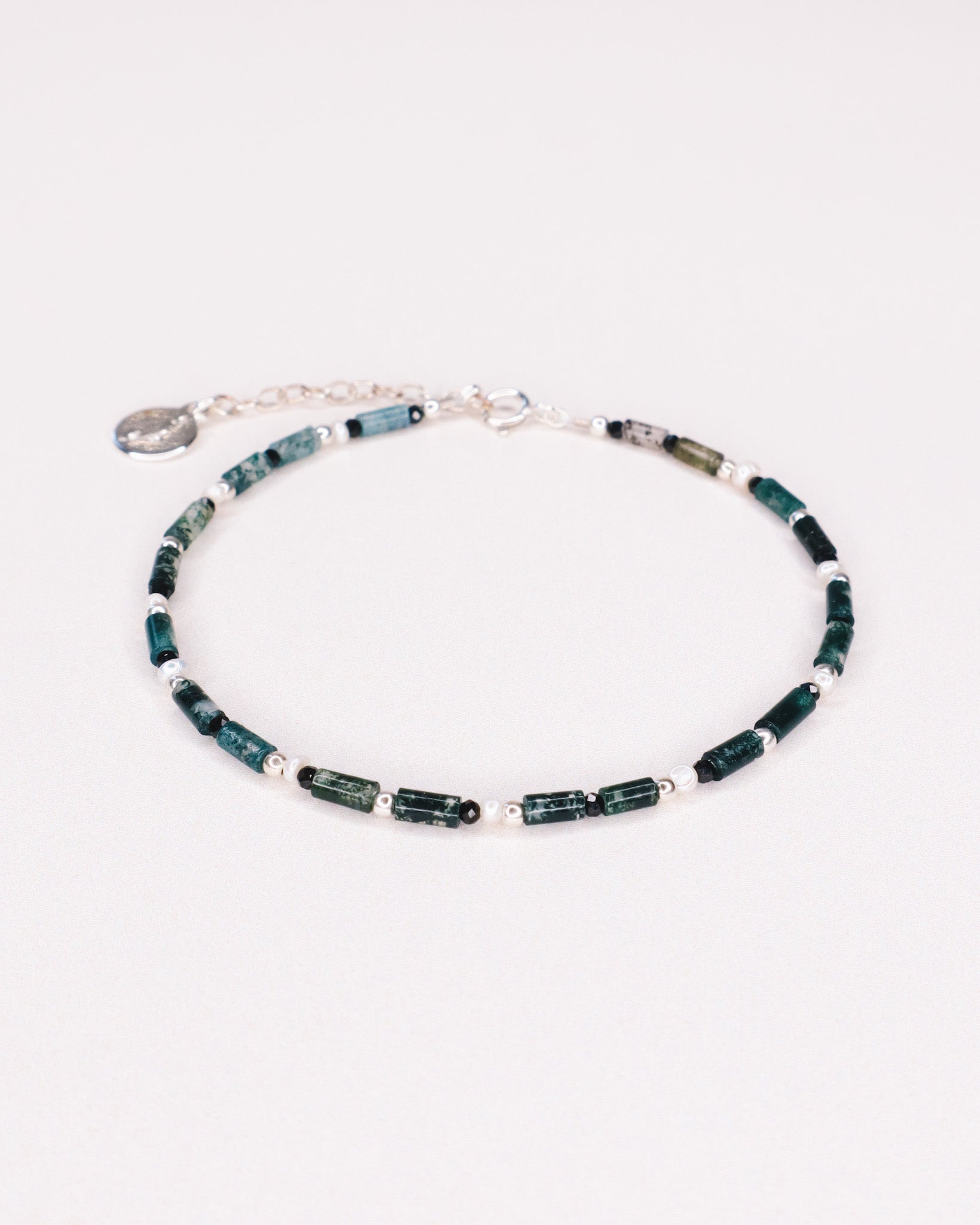 Enfilage de pierres d'agate mousse vertes, de perles de culture et de spinelles noires.