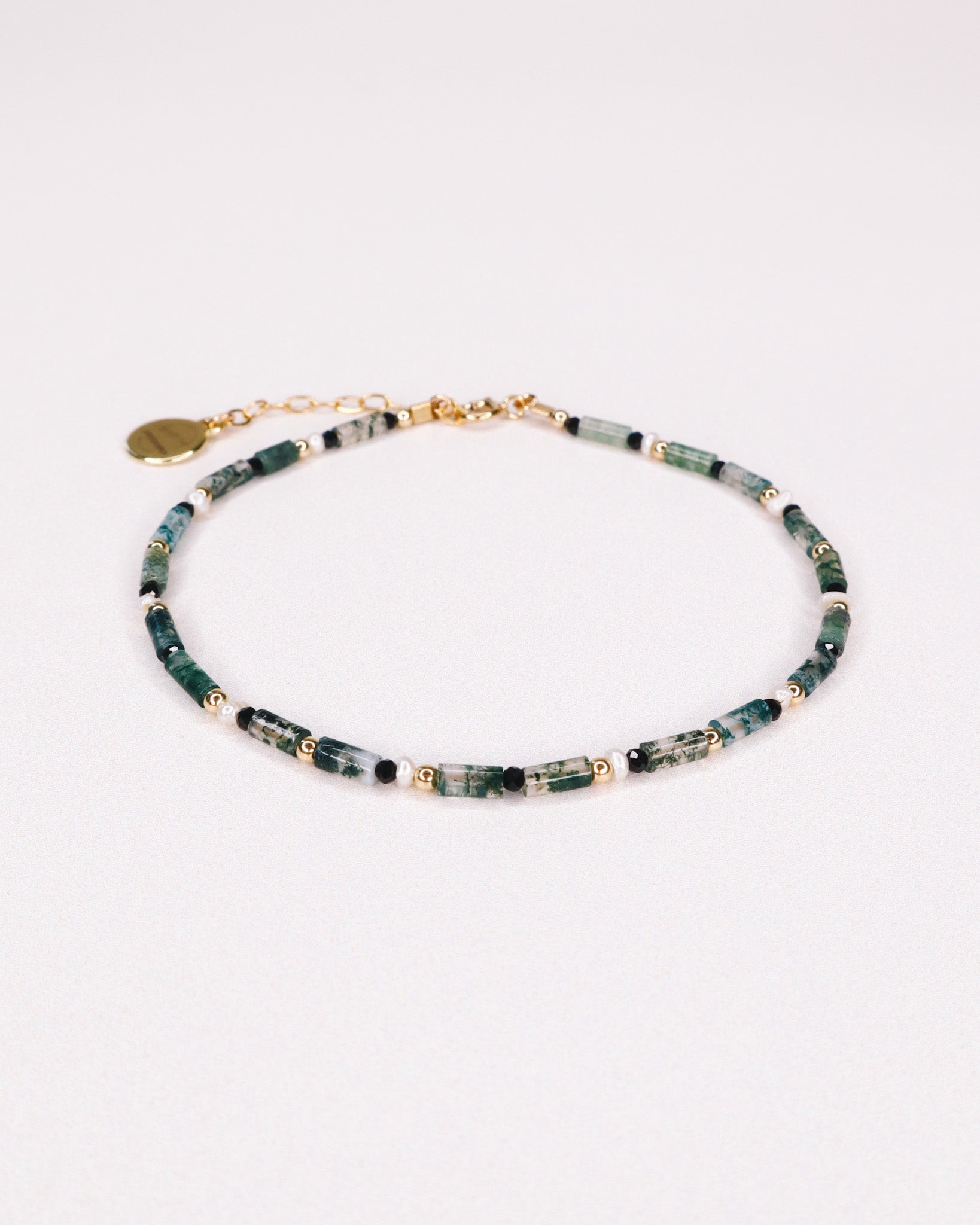 Enfilage de pierres d'agate mousse vertes, de perles de culture et de spinelles noires.