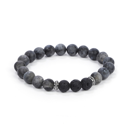 - Le bracelet dévoile une rangée de perles de labradorite. Leur couleur foncée intense est particulièrement mise en valeur par le fini mat du polissage.