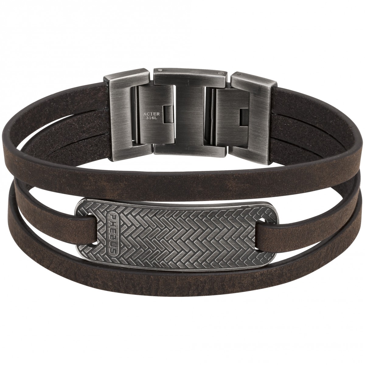 Un mélange solide d'acier inoxydable et de cuir : Le bracelet Amos de Phebus est conçu à partir d'acier 316L inoxydable gris vieilli et de trois bandelettes de cuir marron. Réglable de 19 à 20,5 cm et fermé par un double clip, ce bijou est garanti 2 ans.