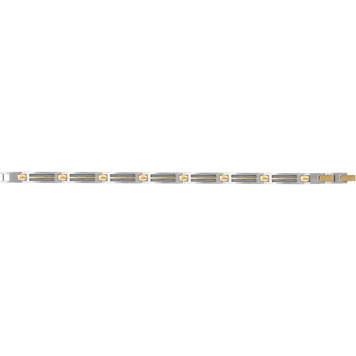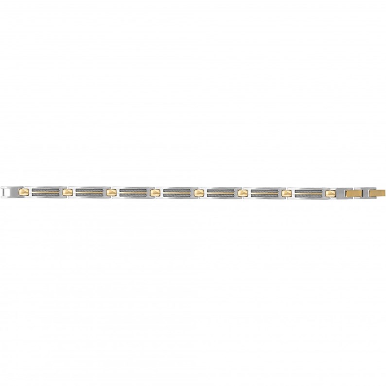 Un bijou de qualité, aux lignes affirmées : Ce robuste bracelet articulé est fait d'acier 316L inoxydable et de PVD bicolore brillant. Réglable de 20,5 à 22 cm, il est orné de morceaux de câble gris disposés en alternance avec des éléments dorés : un must pour ton look ! Doté d'un clip à double fermoir signé Phebus, ce bijou est garanti 2 ans.