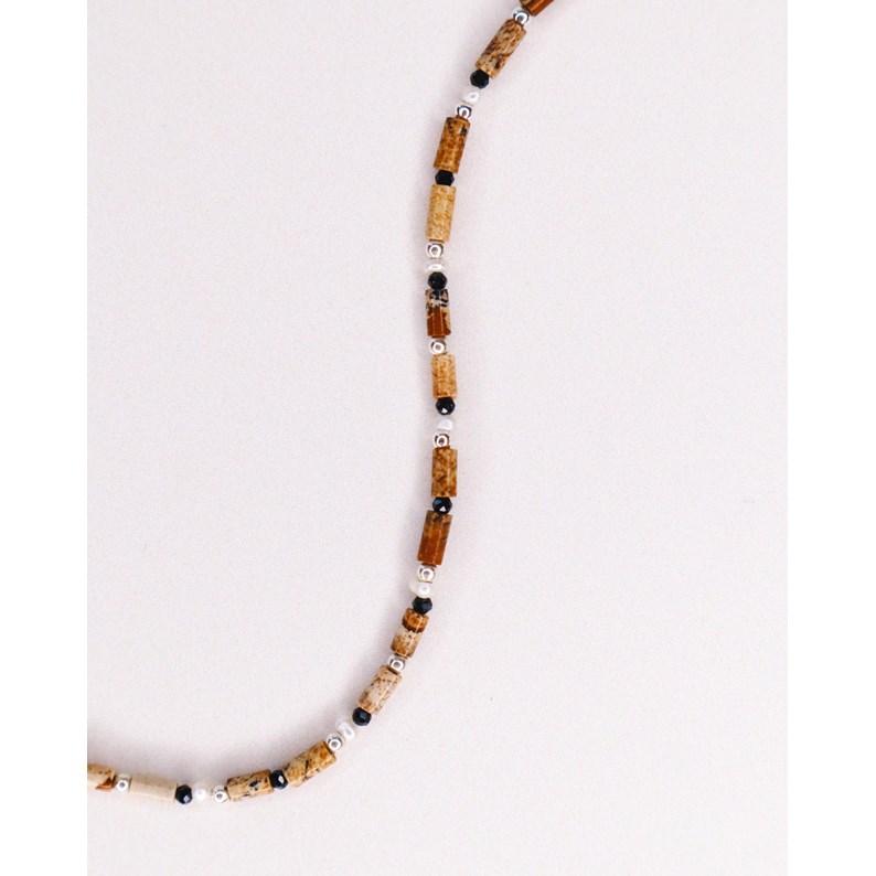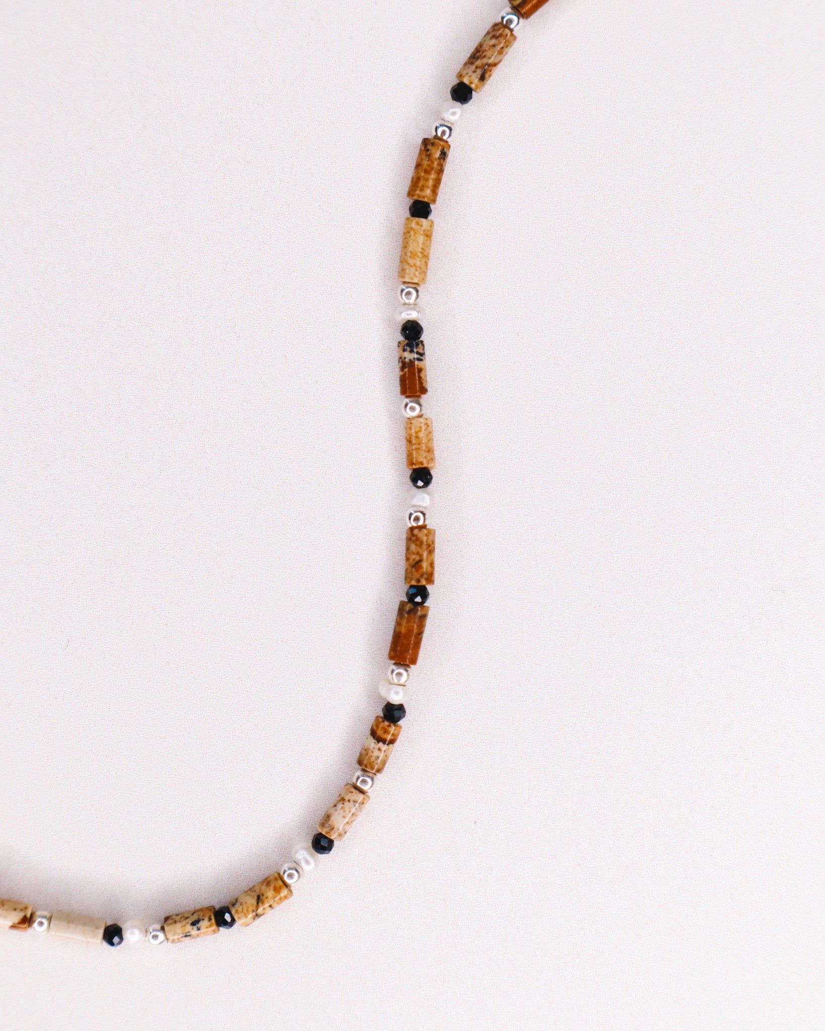 Enfilage de pierres de jaspe paysage marron, de perles de culture et de spinelles noires.