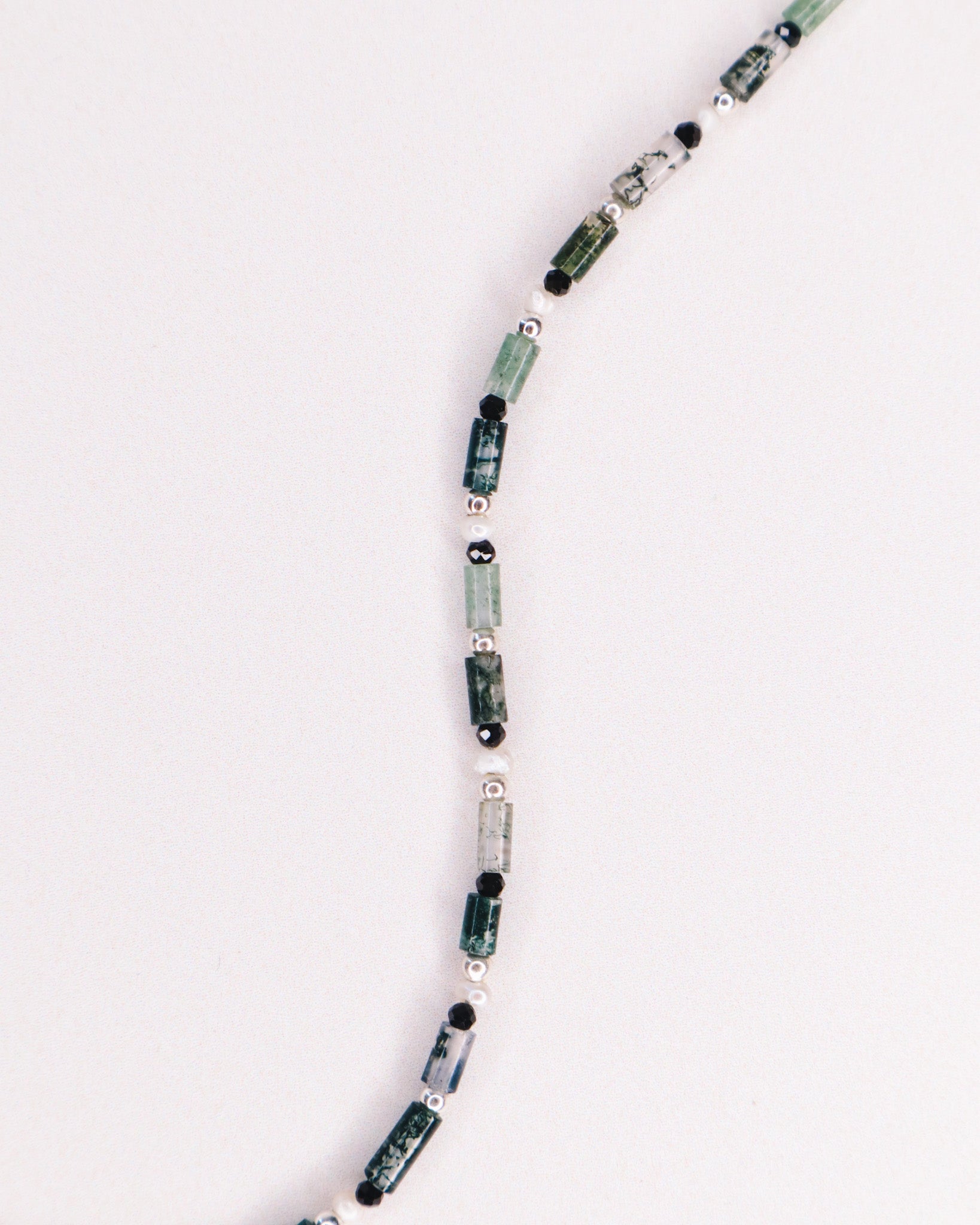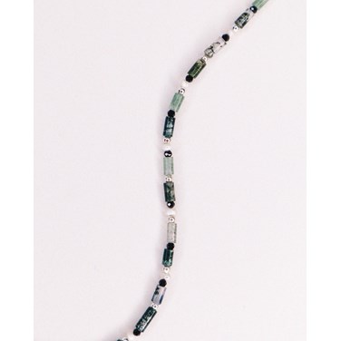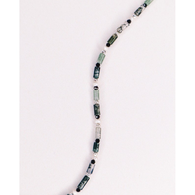 Enfilage de pierres d'agate mousse verte, de perles de culture et de spinelles noires.