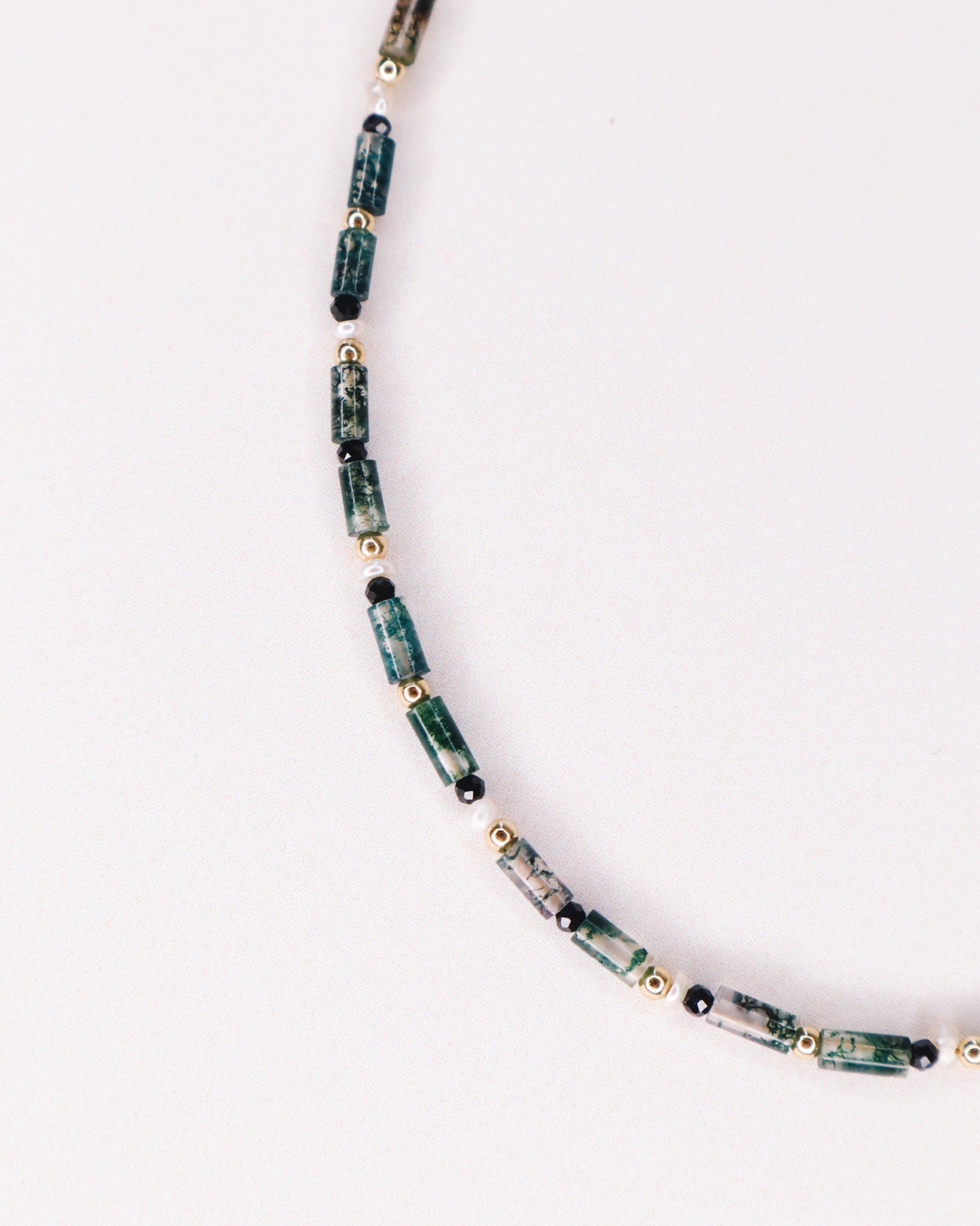Enfilage de pierres d'agate mousse verte, de perles de culture et de spinelles noires.