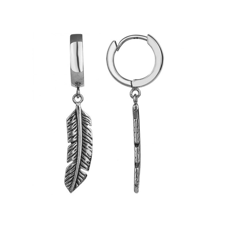 Boucles d'oreilles Legend de type créoles avec motifs plume, en acier 316L inoxydable : Les boucles d'oreilles Plume sont composées d'un anneau en acier inoxydable et d'un pendentif en forme de plume suspendue. Garanties 2 ans et munies d'un fermoir sécurisé, leur solidité t'accompagne au quotidien.