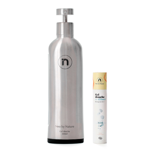 - Votre flacon de gel douche est vide ? Le flacon en acier inoxydable est rechargeable à l'infini. Lavez-le, puis utilisez une recharge de gel douche à diluer pour en profiter plus longtemps.