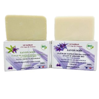 INGREDIENTS : Sodium Shea butterate1, Sodium Cocoate1, Aqua, Glycerin1, Sodium Sesameseedate1, Sodium Sweet Almondate1, Sodium Safflowerate1, Prunus Amygdalus Dulcis Seed Extract*, Crocus Sativus Flower Extract*, Lactobacillus Ferment, Oryza Sativa Extract*, Vanilla Planifolia Fruit Extract*, Saccharum Officinarum Extract*, Acacia Senegal Gum*, Tocopherol, Helianthus Annuus Seed Oil, Citric Acid.INGREDIENTS : Sodium Shea butterate*, Sodium Cocoate*, Glycerin*, Sodium Sesameseedate*, Litsea Cubeba Fruit Oil*, Verbena officinalis Flower/Leaf Water*, Aqua, Illite, Carthamus Tinctorius Seed Oil*, Kaolin (CI77004), Glycerin*, Montmo rillonite, Crocus Sativus Flower Extract*, Lactobacillus Ferment, Tocopherol, Citric Acid, Limonene**, Linalool**, Geraniol**.* Ingrédients issus de l’agriculture biologique** Présents dans l’huile essentielle100 % du total des ingrédients d’origine naturelle dont 74,90 % issus de l’Agriculture Biologique. Procédé de fabrication contrôlé. Caractéristiques certifiées selon le référen tiel l-305 disponible sur www.bureauveritas.fr/besoin/certification-i-305