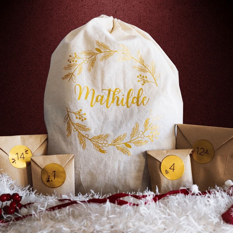 Le pochon du calendrier est cousu artisanalement dans notre atelier à Lyon. Chaque pochon est transféré à chaud sur mesure de manière personnalisée.