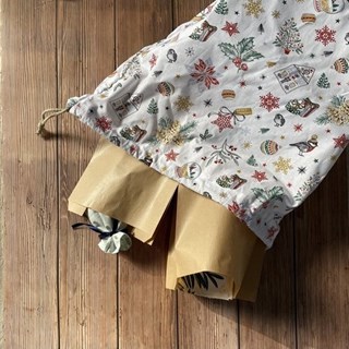 Le calendrier sera livré dans un pochon en tissus aux motifs de noël remplis de 24 sachets en papier kraft qui contiendront les jolies cadeaux utile et beau.