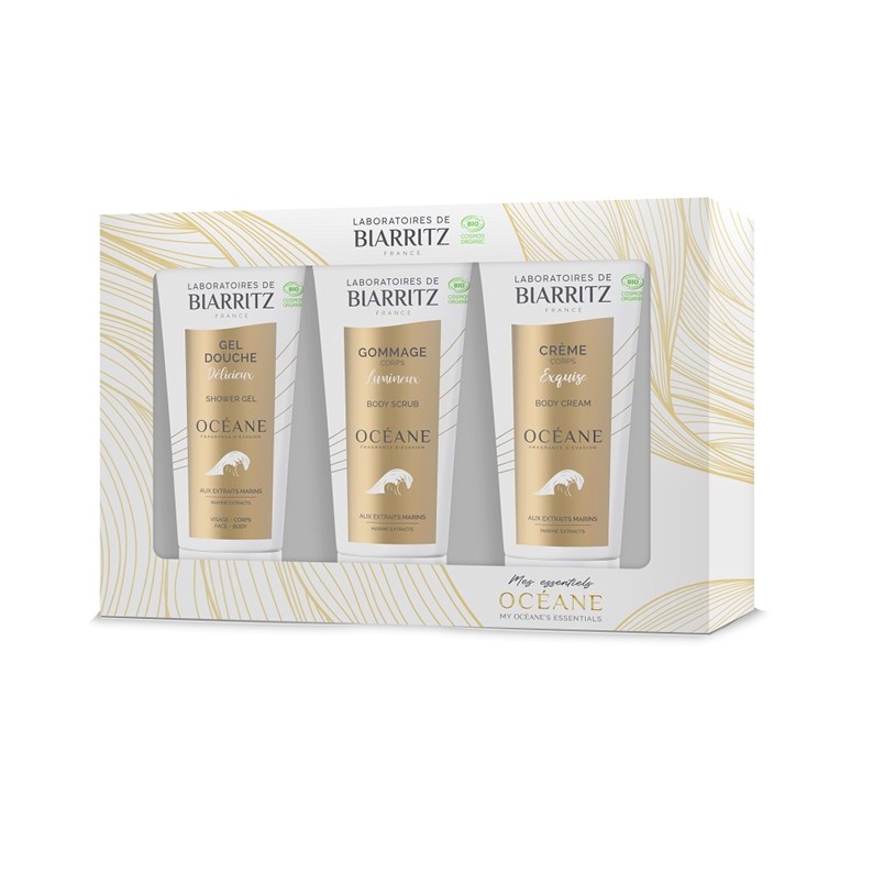Le kit ""Mes essentiels Océane"" comprend trois soins certifiés bio aux actifs marins (algue brune et criste marine). Des essentiels qui se complètent merveilleusement pour un rituel enveloppant et une véritable parenthèse de bien-être.