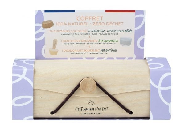 SHAMPOOING : SODIUM COCOYL ISETHIONATE, SODIUM COCO SULFATE, COCOS NUCIFERA OIL, BUTYSPERMUM PARKII BUTTER, STEARIC, AQUA, GLYCERIN, CERA VEGETAL, STEARIC ACID, CADELILA CERA, HYDROGENATED SOYBEAN OIL, MONTMORILLONITE ILLITE KAOLIN, AROME NATUREL DE MURE SAUVAGE, FRAGRANCE NATURELLE DE FEUILLE DE FIGUIER, OCRE ROSE D'ITALIE, BENZOATE, SORBATECANDELILLA WAX, KAOLIN, CITRUS LIMON OIL, CYMABOPOGON MARTINII VAR, MOTIA, CETEARYL ALCOHOL, THEOBROMA CACAO SEED BUTTER, LIMONENE, CITRAL, LINOLOOL / DENTIFRICE : CALCIUM CARBONATE, COCOS NUCIFERA OIL, STEARIC ACID, SODIUM COCOYLISETHIONATE, MENTHA PIPERATA OIL, CHLOROPHYL, LIMONENE / DEODORANT : BUTYROSPERMUM PARKII BUTTER, HYDROGENATED SOYBEAN OIL, STEARIC ACID, CETEARYL WHEAT STRAW GLYCOSIDES, CANDELILLA WAX, KAOLIN, CITRUS LIMON OIL, CYMABOPOGON MARTINII VAR, MOTIA, CETEARYL ALCOHOL, THEOBROMA CACAO SEED BUTTER, LIMONENE, CITRAL, LINOLOOL