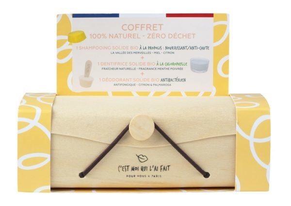 SHAMPOOING :SODIUM COCOYL ISETHIONATE, SODIUM COCO SULFATE, COCOS NUCIFERA OIL ET BUTYSPERMUM PARKII BUTTER, STEARIC, AQUA, GLYCERIN, CERA VEGETAL, STEARIC ACID, CANDELILA CERA, HYDROGENATED SOYBEAN OIL, MEL, CITRUS LIMON OIL, PROPOLIS, BENZOATE, SORBATE, LIMONENE, CITRAL / DENTIFRICE : CALCIUM CARBONATE, COCOS NUCIFERA OIL, STEARIC ACID, SODIUM COCOYLISETHIONATE, MENTHA PIPERATA OIL, CHLOROPHYL, LIMONENE / DEODORANT : BUTYROSPERMUM PARKII BUTTER, HYDROGENATED SOYBEAN OIL, STEARIC ACID, CETEARYL WHEAT STRAW GLYCOSIDES, CANDELILLA WAX, KAOLIN, CITRUS LIMON OIL, CYMABOPOGON MARTINII VAR, MOTIA, CETEARYL ALCOHOL, THEOBROMA CACAO SEED BUTTER, LIMONENE, CITRAL, LINOLOOL