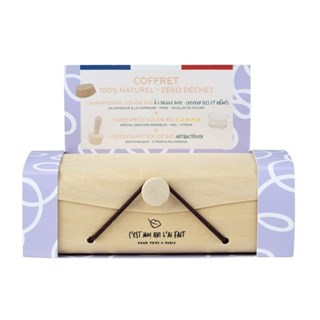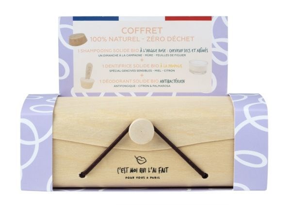 SHAMPOOING : SODIUM COCOYL ISETHIONATE, SODIUM COCO SULFATE, COCOS NUCIFERA OIL, BUTYSPERMUM PARKII BUTTER, STEARIC, AQUA, GLYCERIN, CERA VEGETAL, STEARIC ACID, CADELILA CERA, HYDROGENATED SOYBEAN OIL, MONTMORILLONITE ILLITE KAOLIN, AROME NATUREL DE MURE SAUVAGE, FRAGRANCE NATURELLE DE FEUILLE DE FIGUIER, OCRE ROSE D'ITALIE, BENZOATE, SORBATE. :DENTIFRICE : CALCIUM CARBONATE, COCOS NUCIFERA OIL, STEARIC ACID, SODIUM COCOYL ISETHIONATE, CITRUS LIMON OIL, PROPOLIS, LIMONENE, LINOLOOL, CITRAL./ DEODORANT : BUTYROSPERMUM PARKII BUTTER, HYDROGENATED SOYBEAN OIL, STEARIC ACID, CETEARYL WHEAT STRAW GLYCOSIDES, CANDELILLA WAX, KAOLIN, CITRUS LIMON (CITRON) OIL, CYMABOPOGON MARTINII VAR, MOTIA, CETEARYL ALCOHOL, THEOBROMA CACAO SEED BUTTER, LIMONENE, CITRAL, LINOLOOL
