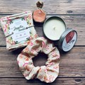 - Un jolie chouchou assortie en coton pour attacher les cheveux d'un petit savon naturel saponifié à froid ( parfum aléatoire suivant la box) et d'une bougie naturelle en cire de colza Européenne et parfum Français naturel d'Ylang Ylang pour un effet de détente absolu.