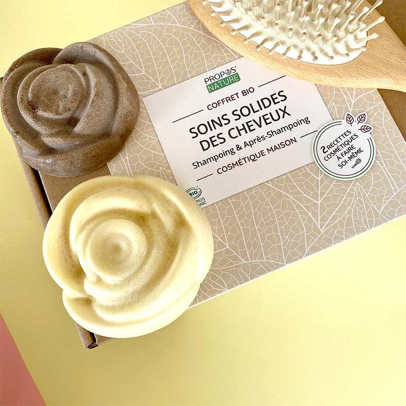 Ce coffret comprend l’ensemble des ingrédients naturels, le matériel, le packaging et la recette vous permettant de réaliser très facilement un Shampoing solide et un Après-shampoing solide de 50g.