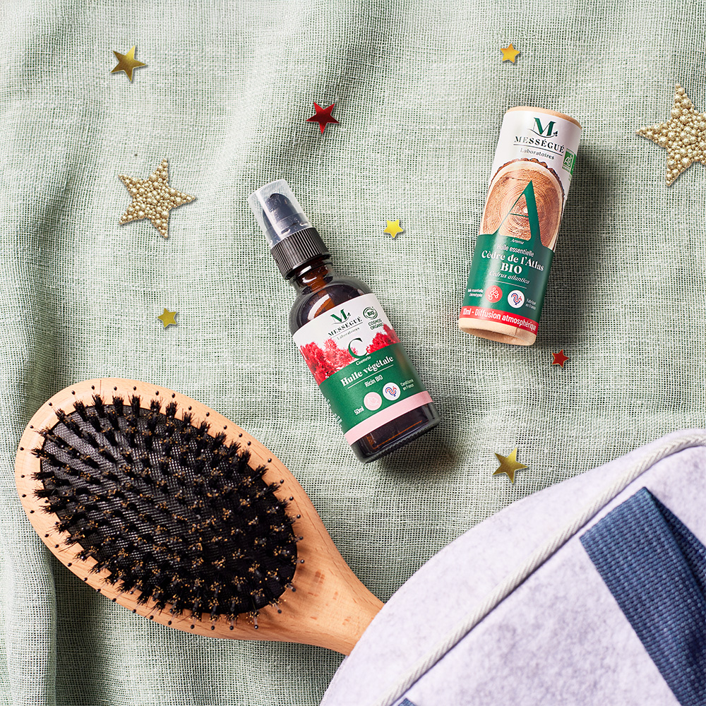 - Brosse en bois : favorise un brossage doux et efficace tout en stimulant le cuir chevelu.