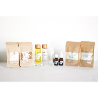Les ingrédients sont biologiques. Les ingrédients liquides sont contenus dans des flacons en verre réutilisables et les ingrédients solides sont contenus dans des sachets en kraft.
