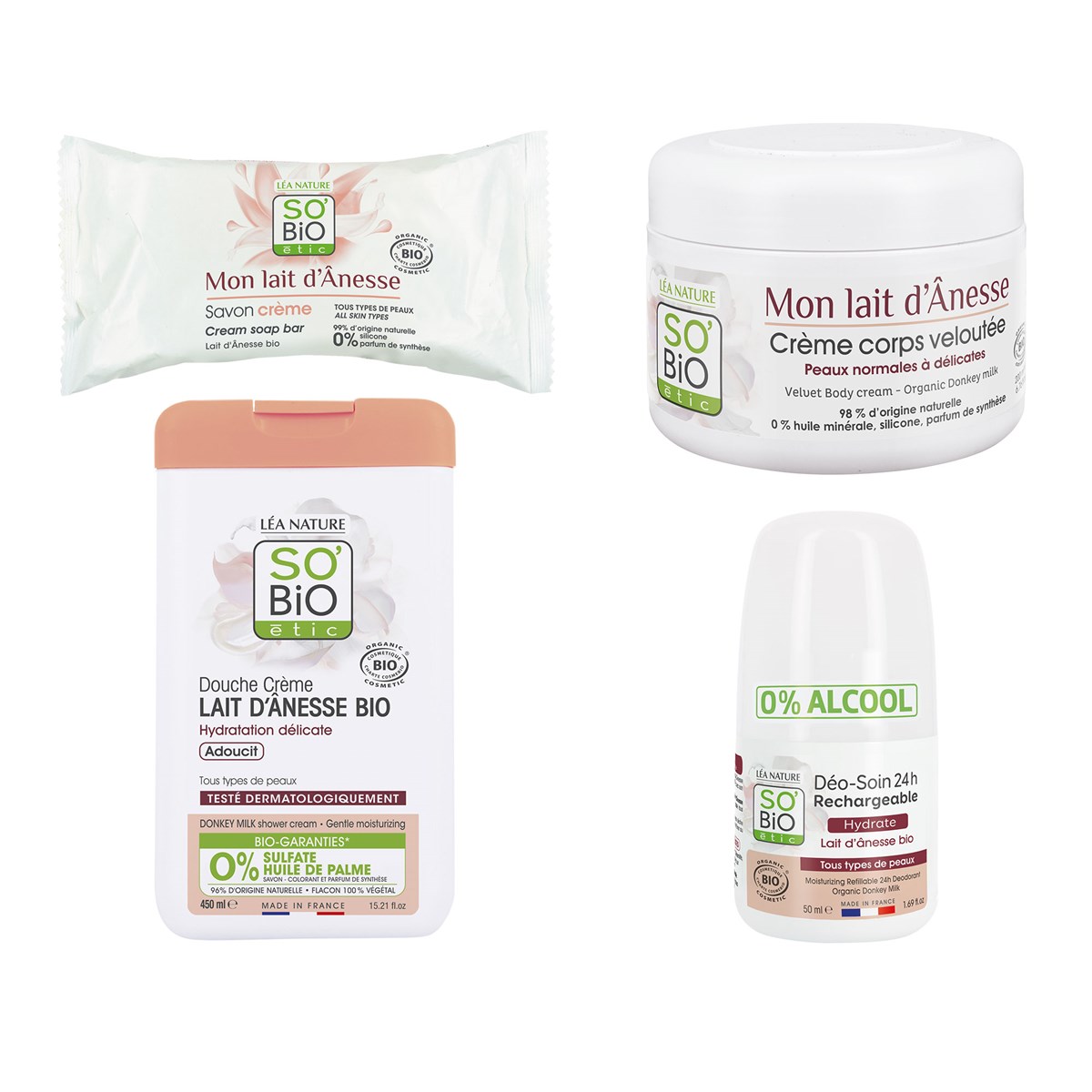 Votre peau réclame de la douceur ! Fondez pour la routine certifiée bio par SO'BiO étic®, enrichie au Lait d'Ânesse bio origine France pour prendre soin de votre corps.