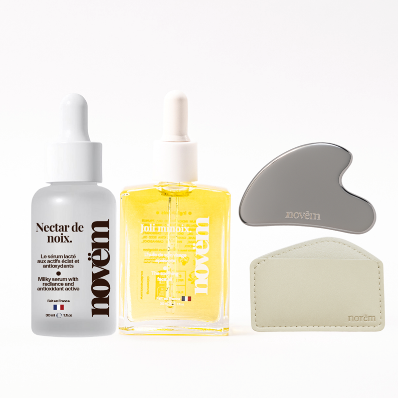?Accessoire Gua sha, dans sa pochette en cuir naturel, stimule la circulation pour un éclat instantané.