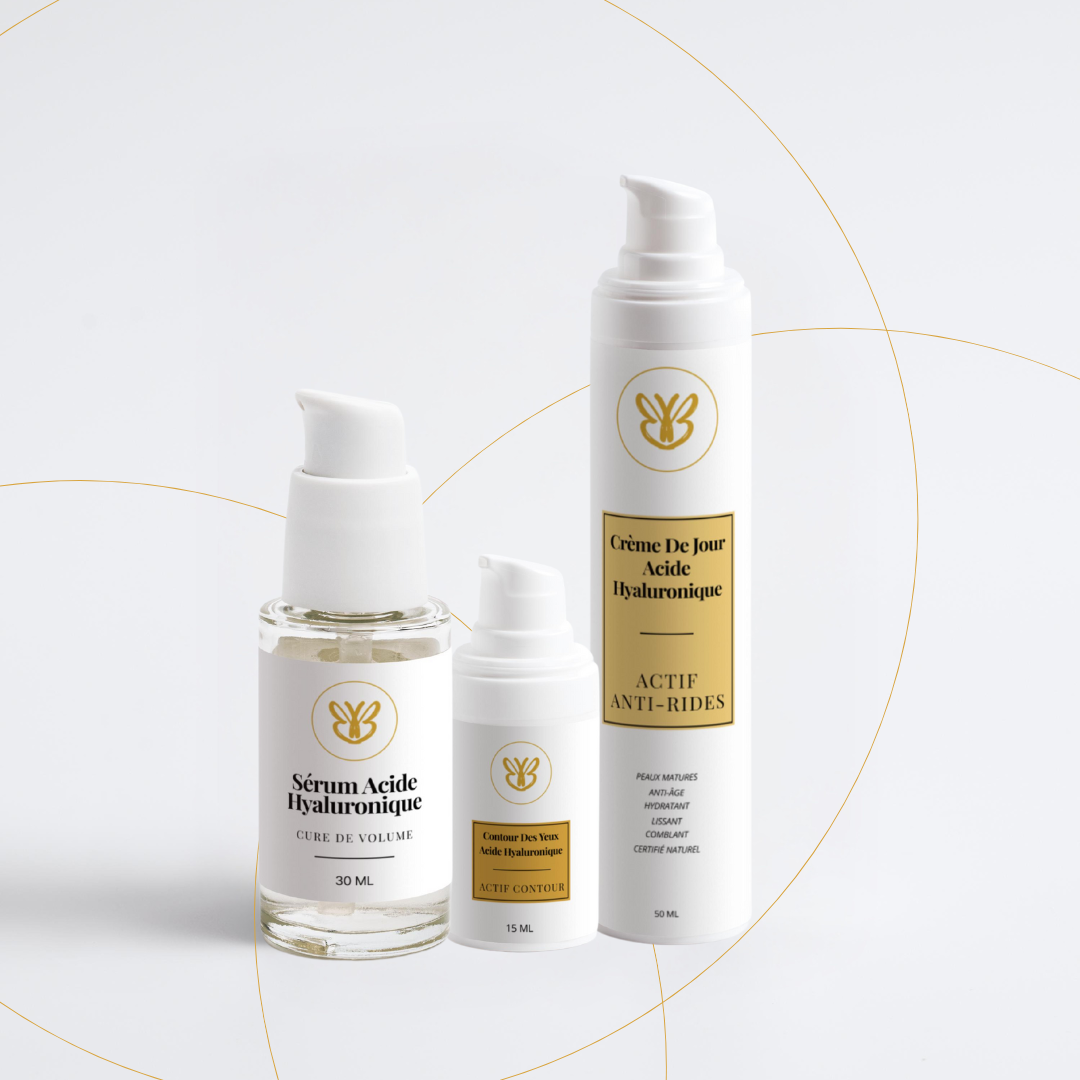 - Cure de Volume – Sérum à l’acide hyaluronique (30 ml) : hydrate intensément et repulpe la peau.
