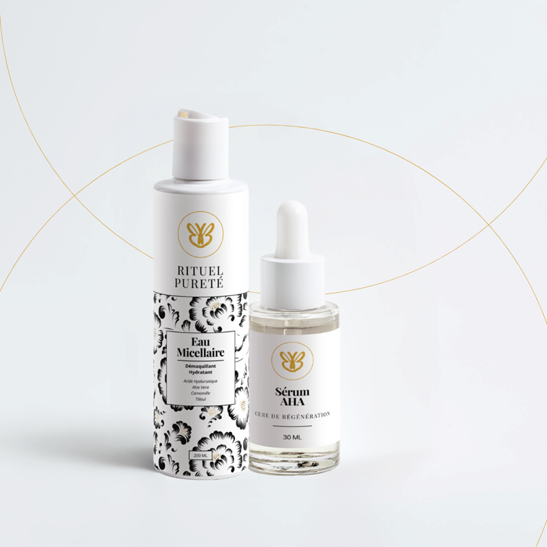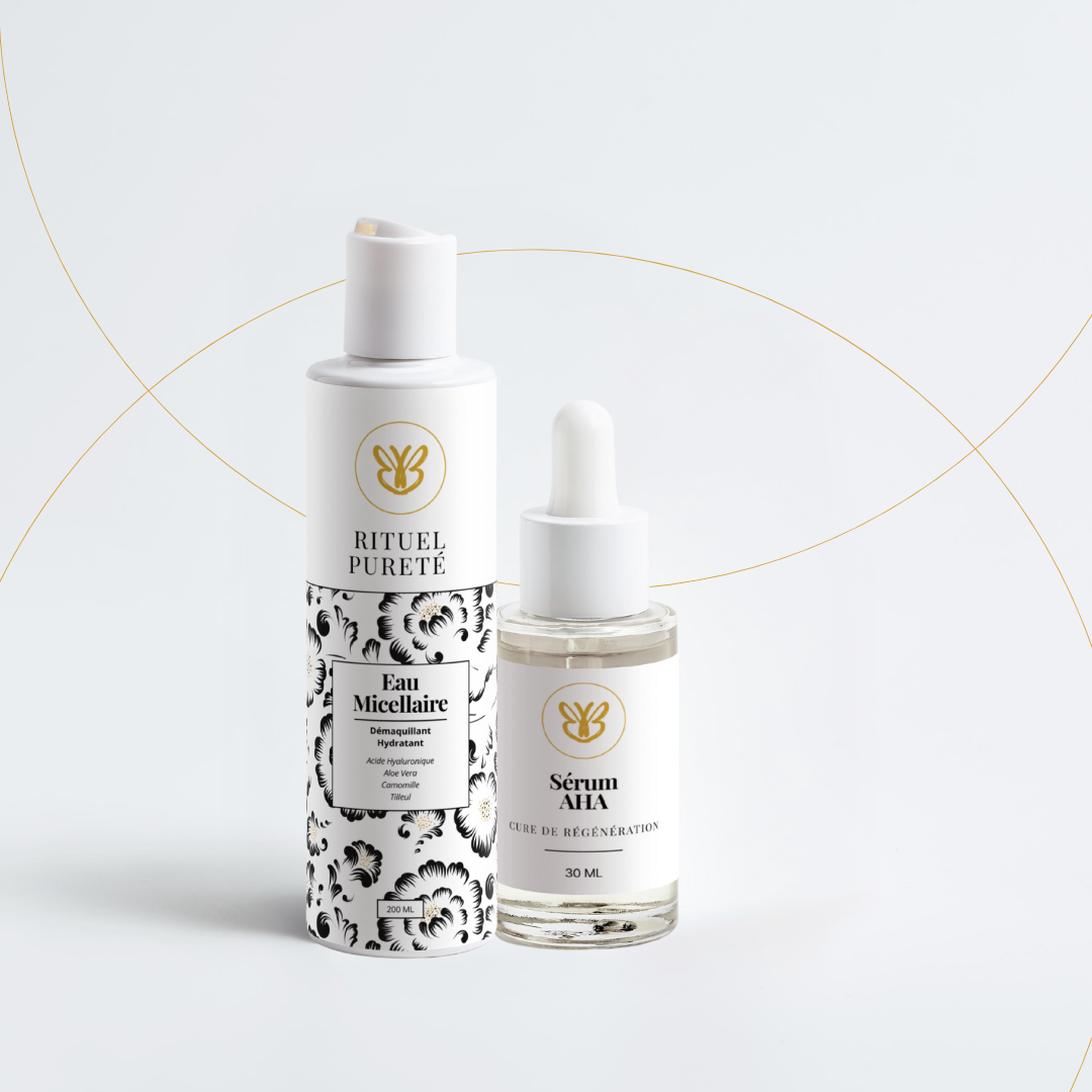 Peau plus lisse, pores visiblement resserrés. Un duo purifiant & régénérant pensé pour les peaux matures avec pores visibles et texture irrégulière : l’Eau Micellaire Rituel Pureté nettoie en douceur, puis le sérum Cure de Régénération (AHA) affine le grain de peau et ravive l’éclat.