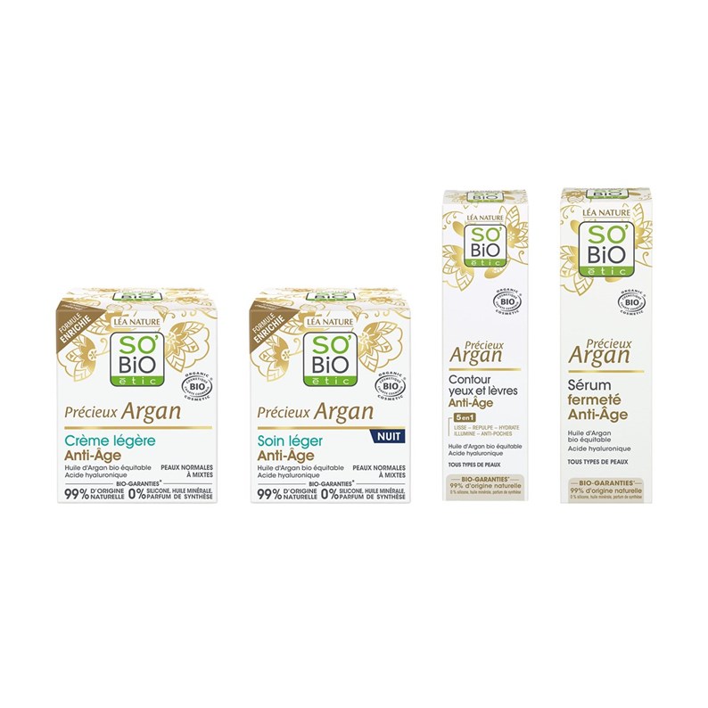 Ingrédients : CRÈME LÉGÈRE : Aqua / Water / Eau, Caprylic / Capric Triglyceride, Glyceryl Stearate Citrate, Dicaprylyl Ether, Glycerin, Argania Spinosa Kernel Oil***, Propanediol, Cetearyl Alcohol, Sodium Hyaluronate, Aloe Barbadensis Leaf Juice Powder***, Helianthus Annuus (Sunflower) Seed Oil, Tocopherol, Xanthan Gum, Parfum (Fragrance), Levulinic Acid, Sodium Levulinate, Sodium Hydroxide, Benzyl Alcohol, Sodium Benzoate, Linalool, Limonene, Anise Alcohol SOIN LÉGER NUIT : Aqua/Water/Eau, Glycerin, Argania Spinosa Kernel Oil***, Caprylic/Capric Triglyceride, Propanediol, Cetearyl Olivate, Sorbitan Olivate, Pentylene Glycol, Sodium Hyaluronate, Hydrolyzed Hyaluronic Acid, Aloe Barbadensis Leaf Juice Powder***, Acacia Decurrens/Jojoba/Sunflower Seed Wax Polyglyceryl-3 Esters, Candelilla Cera /Euphorbia Cerifera (Candelilla) Wax/Cire De Candelilla, Ricinus Communis (Castor) Seed Oil, Olus Oil/Vegetable Oil/Huile Vegetale, Hydrogenated Castor Oil, Hydrogenated Vegetable Oil, Bentonite, Sclerotium Gum, Xanthan Gum, Parfum (Fragrance), Levulinic Acid, Sodium Levulinate, Phytic Acid, Benzyl Alcohol, Sodium Benzoate, Sodium Hydroxide, Linalool, Limonene, Anise Alcohol CONTOUR YEUX-LÈVRES : Aqua /Water/Eau, Anthemis Nobilis Flower Water*, Argania Spinosa Kernel Oil*, Dicaprylyl Carbonate, Glycerin, Cetearyl Olivate, Sorbitan Olivate, Behenyl Alcohol, Caprylic/Capric Triglyceride, Sodium Levulinate, Benzyl Alcohol, Xanthan Gum, Sodium Benzoate, Parfum (Fragrance), Hydrogenated Vegetable Oil, Chlorella Vulgaris Extract, Polygonum Fagopyrum (Seed) Extract, Linalool, Limonene, Sodium Hydroxide, Lactic Acid, Benzyl Salicylate, Sodium Hyaluronate, Anise Alcohol, Tocopherol, Amyl Cinnamal, Glycine Soja (Soybean) Oil * Ingrédients Issus De L'Agriculture Biologique / Ingredient From Organic Farming SÉRUM FERMETÉ : Aqua /Water/Eau, Anthemis Nobilis Flower Water*, Glycerin, Coco-Caprylate, Cocoglycerides, Glyceryl Stearate Citrate, Polyglyceryl-3 Stearate, Microcrystalline Cellulose, Benzyl Alcohol, Argania Spinosa Kernel Oil*, Hexyldecanol, Hexyldecyl Laurate, Hydrogenated Lecithin, Ribose, Jojoba Esters, Parfum (Fragrance), Xanthan Gum, Cellulose Gum, Avena Sativa (Oat) Kernel Extract*, Dehydroxanthan Gum, Linum Usitatissimum (Linseed) Seed Extract, Linalool, Limonene, Sodium Levulinate, Sodium Hyaluronate, Sodium Phytate, Sodium Benzoate, Tocopherol, Benzyl Salicylate, Glyceryl Caprylate, P-Anisic Acid, Helianthus Annuus (Sunflower) Seed Oil, Lactic Acid, Sodium Hydroxide, Anise Alcohol, Amyl Cinnamal, Geraniol, Alcohol * Ingrédients Issus De L'Agriculture Biologique / Ingredient From Organic Farming