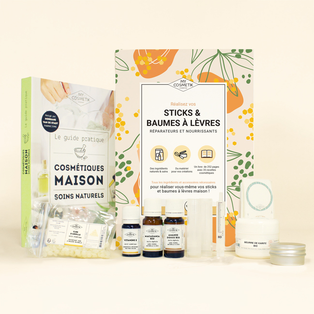 - À l'intérieur de ce coffret, découvrez tout ce dont vous avez besoin (ingrédients + matériel) pour réaliser à la maison vos propres sticks et baumes à lèvres.