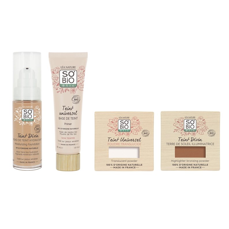 Ingrédients : FOND DE TEINT : Ingrédients : Anthemis Nobilis Flower Water*, Dicaprylyl Carbonate, Dicaprylyl Ether, Aqua /Water/Eau, Coco-Caprylate/Caprate, Polyglyceryl-6 Polyhydroxystearate, Hydrogenated Castor Oil, Polyglyceryl-6 Polyricinoleate, Lauroyl Lysine, Aloe Barbadensis Leaf Juice*, Magnesium Sulfate, Parfum (Fragrance), Sea Salt, Sodium Levulinate, Oryza Sativa (Rice) Powder*, Trihydroxystearin, Sodium Benzoate, Glyceryl Caprylate, Glyceryl Undecylenate, Glycerin, Lactic Acid, Sodium Lauroyl Glutamate, Sodium Hyaluronate, Lysine, Magnesium Chloride, Tocopherol, Citric Acid, Glycine Soja (Soybean) Oil +/- : Titanium Dioxide (Ci 77891), Ci 77492 (Iron Oxides), Ci 77491 (Iron Oxides), Ci 77499 (Iron Oxides) * Ingrédients Issus De L'Agriculture Biologique POUDRE DE TEINT : Mica, Tapioca Starch*, Saccharomyces Ferment, Kaolin, Lauroyl Lysine, Hydrogenated Castor Oil, Undecane, Mangifera Indica (Mango) Seed Butter*, Cellulose, Tridecane, Magnesium Stearate, Helianthus Annuus (Sunflower) Seed Oil, Parfum (Fragrance), Rubus Idaeus (Raspberry) Seed Oil*, Coco-Caprylate/Caprate, Hydrogenated Olive Oil Unsaponifiables, Tocopherol, Aloe Barbadensis Leaf Extract*, Oryza Sativa (Rice) Powder*, Jojoba Esters. TERRE DE SOLEIL : Mica, Calcium Carbonate, Tapioca Starch*, Ci 77491 (Iron Oxides), Helianthus Annus (Sunflower) Seed Oil*, Kaolin, Lauroyl Lysine, Hydrogenated Castor Oil, Cellulose, Ci 77492 (Iron Oxides), Hydrogenated Olive Oil Decyl Esters, Mangifera Indica (Mango) Seed Butter*, Parfum (Fragrance), Rubus Idaeus (Raspberry) Seed Oil*, Ci 77499 (Iron Oxides), Glycolipids, Tocopherol, Aloe Barbadensis Leaf Extract*, Oryza Sativa (Rice) Powder*, Jojoba Esters, Magnesium Stearate, Tin Oxide. * Ingrédients Issus De L'Agriculture Biologique BASE DE TEINT : Ingredients : Aqua/Water/Eau, Hamamelis Virginiana (Witch Hazel) Leaf Water, Glycerin, Mica, Dicaprylyl Carbonate, Glyceryl Stearate Citrate, Caprylic/Capric Triglyceride, Simmondsia Chinensis (Jojoba) Seed Oil, Cetearyl Alcohol, Parfum (Fragrance), Oryza Sativa (Rice) Powder, Levulinic Acid, Sodium Benzoate, Glyceryl Caprylate, Glyceryl Undecylenate, Sodium Stearoyl Glutamate, Xanthan Gum, Sodium Levulinate, Sodium Hydroxide, Lactic Acid, Tocopherol, Glycine Soja (Soybean) Oil.
