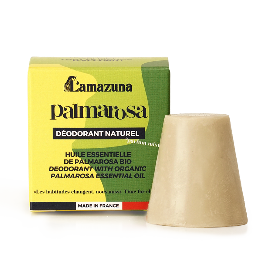 Ce produit est 100% d'origine naturelle, labellisé bio COSMOS Organic. Explication des ingrédients qui limitent la transpiration et bloquent les odeurs :L'huile essentielle de palmarosa (Cymbopogon martini oil* ) grignote les bactéries. C'est grâce à elle que notre déodorant est aussi efficace !Le bicarbonate de soude régule le pH du déodorant pour une plus grande efficacitéL'argile blanche (kaolinite) est utilisée pour ses propriétés purifiantes et assainissantesGeraniol*, linalool*, citral*, farnesol*, limonene* : Composants de l'huile essentielle de palmarosa qu'il est obligatoire d'indiquer sur l'étiquetteExplication des ingrédients qui nourrissent votre peau :L'huile de coco (Cocos nucifera oil*) nourrit la peauUne cire tirée du tournesol (Helianthus annuus seed cera*) pour donner à notre déodorant sa consistance solide, en plus d'assouplir et adoucir la peau.Cetearyl wheat straw glycosides (and) cetearyl alcohol : Ils stabilisent la compositionAcetic acid / acide acétique : Conservateur d'origine naturelleContenance : 30mL et PAO : 12 mois.Ne convient pas aux femmes enceintes et allaitantes ni aux enfants de moins de 12 ans