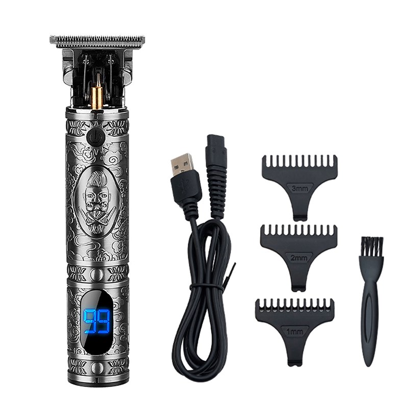 Tondeuse à cheveux et barbe JM-700AL. • Comprend : tondeuse + manuel d'instructions + peigne limite*3 (1 2 3 mm) + câble USB + brosse de nettoyage. • Tête de coupe efficace à angle vif, durable et tranchante, pour une coupe précise des cheveux, améliore considérablement l'efficacité du rasage. • Électricité longue durée • Le corps est gravé d'une tête d'huile de style rétro. • Écran LED : visualisation pratique de l'indicateur d'alimentation. • Disponible pour travailler pendant 180 minutes après une charge complète. • Facile à utiliser et à nettoyer.